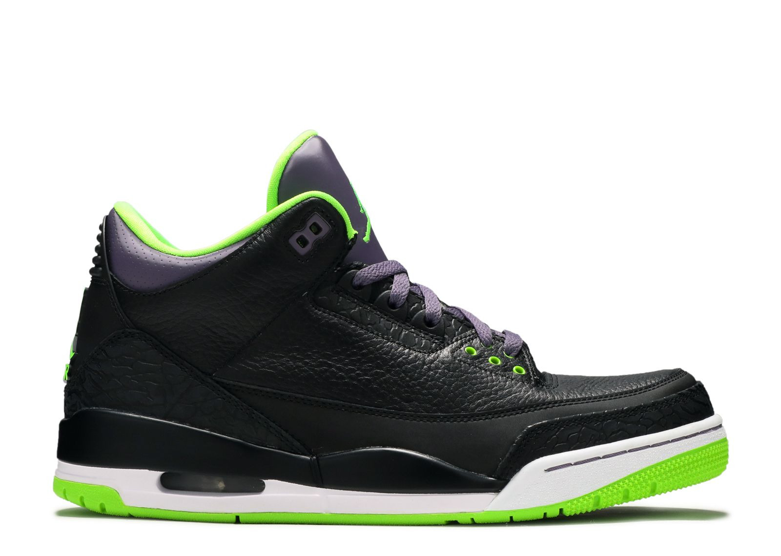 Inspired by Michael Jordan saying, 'By the time you see me coming, it's too late,' the Air Jordan 3 Retro 'Joker' features a stealthy colorway with vibrant accents. The shoe's black leather upper includes elephant print overlays, while Electric Green and Canyon Purple hits recall the shoe's namesake Batman villain. Visible Air in the heel provides cushioning, and the shoe released for the 2013 NBA All-Star Game. SKU: 136064 018 Colorway: Black/Elctrc Grn-Cnyn Prpl-Wht Release Date: 2/16/13
