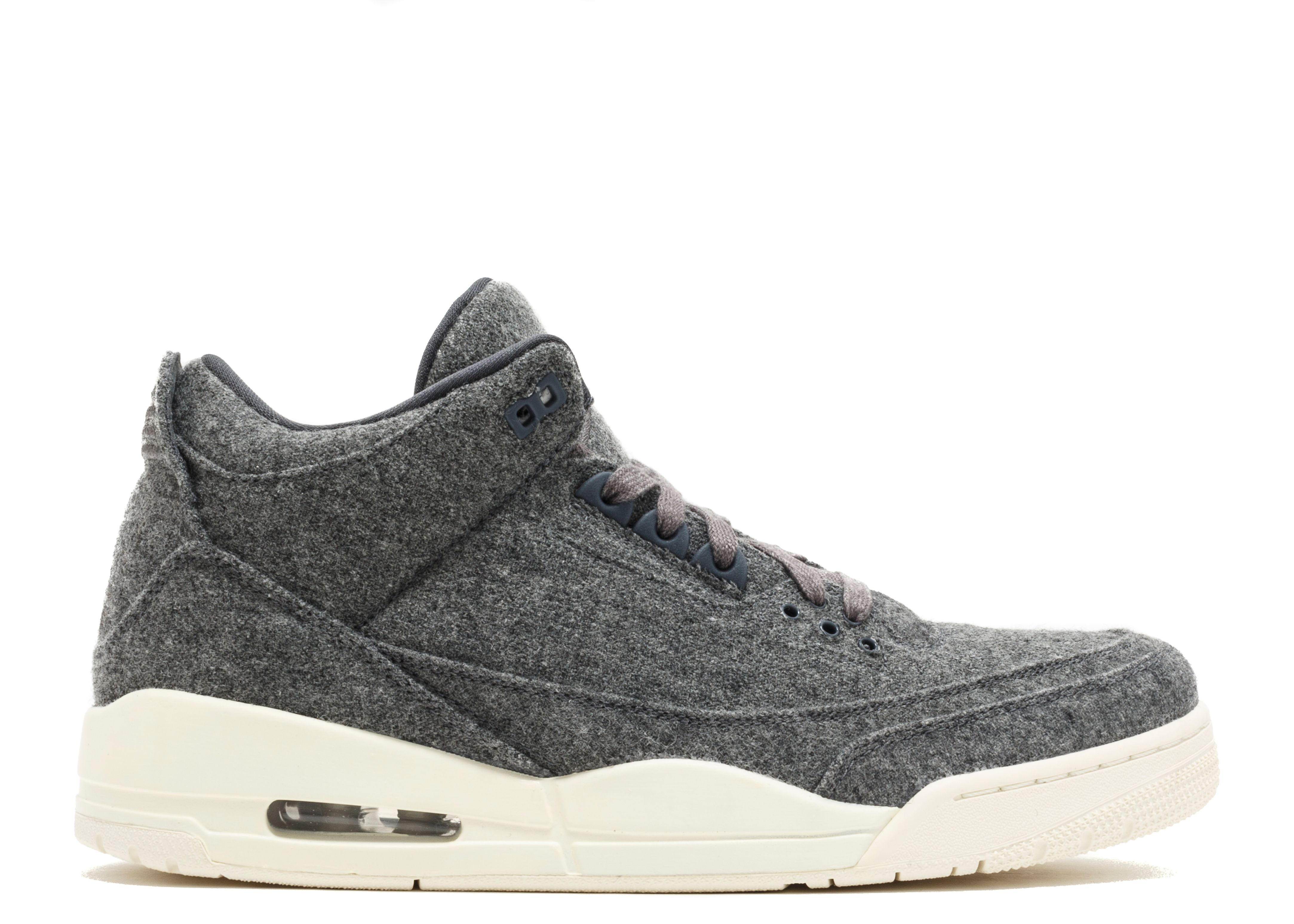 The Air Jordan 3 Retro ‘Wool’ updates Tinker Hatfield’s classic 1988 design with an unexpected build. The mid-top replaces its customary leather upper and elephant-print detailing with a cozy woolen construction in monochromatic dark grey. Jumpman branding at the tongue and heel continue the all-grey theme, while the midsole and rubber outsole are executed in off-white Sail. SKU: 854263 004 Colorway: Dark Grey/Dark Grey-Sail Release Date: 12/17/16