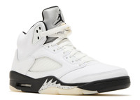 The Air Jordan 5 Retro 'White Black', also known as the Jordan 5 'Reverse Metallic', rocks a white leather upper with matching molded eyelets and signature netting on the side. Black knit touches the padded collar, while the tongue is treated with a reflective, silver finish and a bold Jumpman logo. The foam midsole packs an Air-sole heel unit and a speckled, silver shark tooth area. A partially see-through rubber outsole keeps the herringbone pattern designed for enhanced traction on the court. SKU: DD0587 110 Colorway: White/Black/Sail/Metallic Silver Release Date: 12/7/24