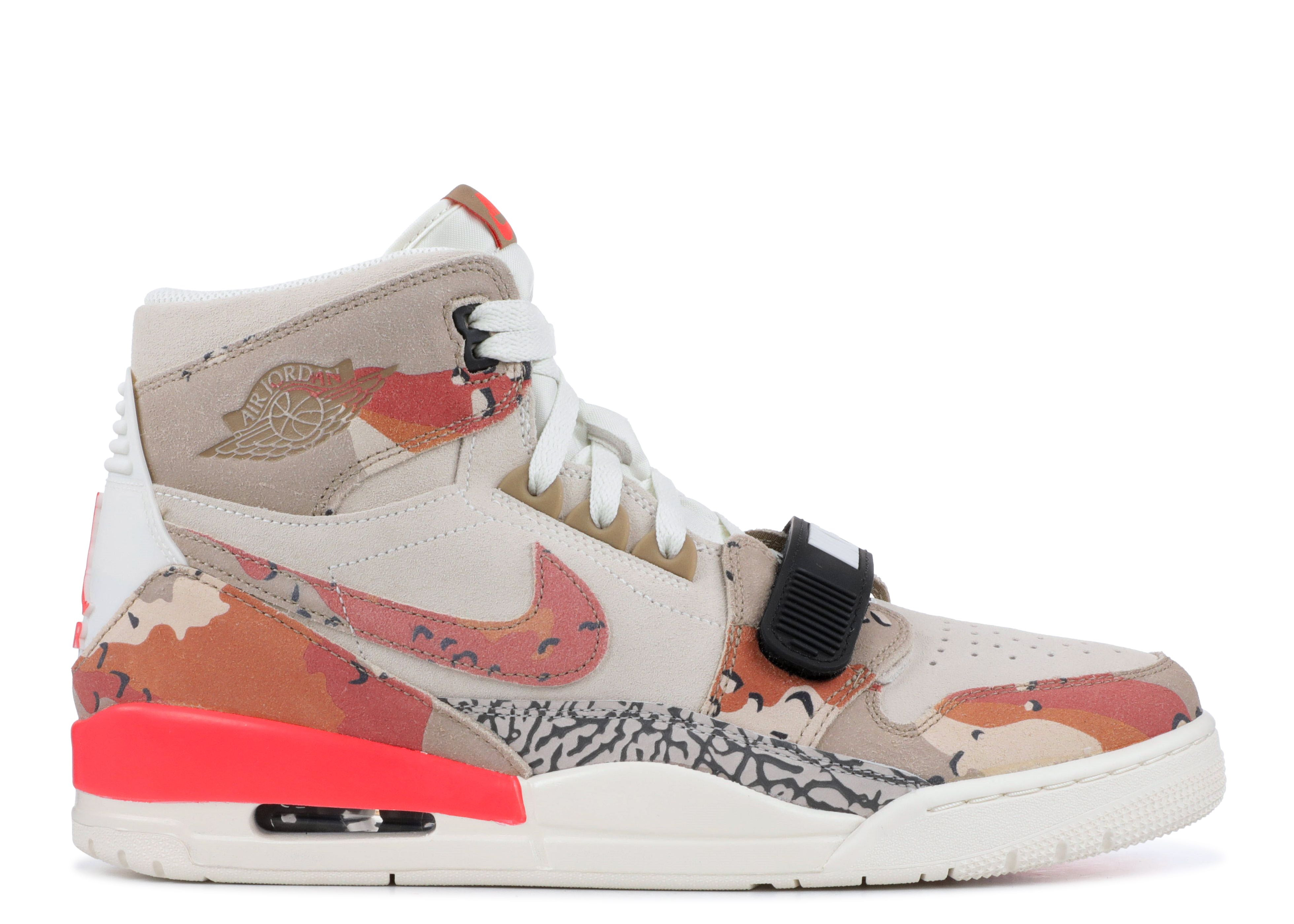 Created by Don C in a joint venture with Jordan Brand, the Jordan Legacy 312 offering shows off its military influence with the ‘Desert Camo’ design. The sneaker’s high-top profile is adorned with a tan printed suede upper with tonal Desert Camo flair on the toe box, Swoosh, quarter panel, and collar. On the heel counter and branding, hits of Infrared 23 emerge, and a black Nike-branded strap rests on the cream-colored laces. SKU: AV3922 126 Colorway: Sail/Desert Camo-Infrared 23 Release Date: 12/31/18