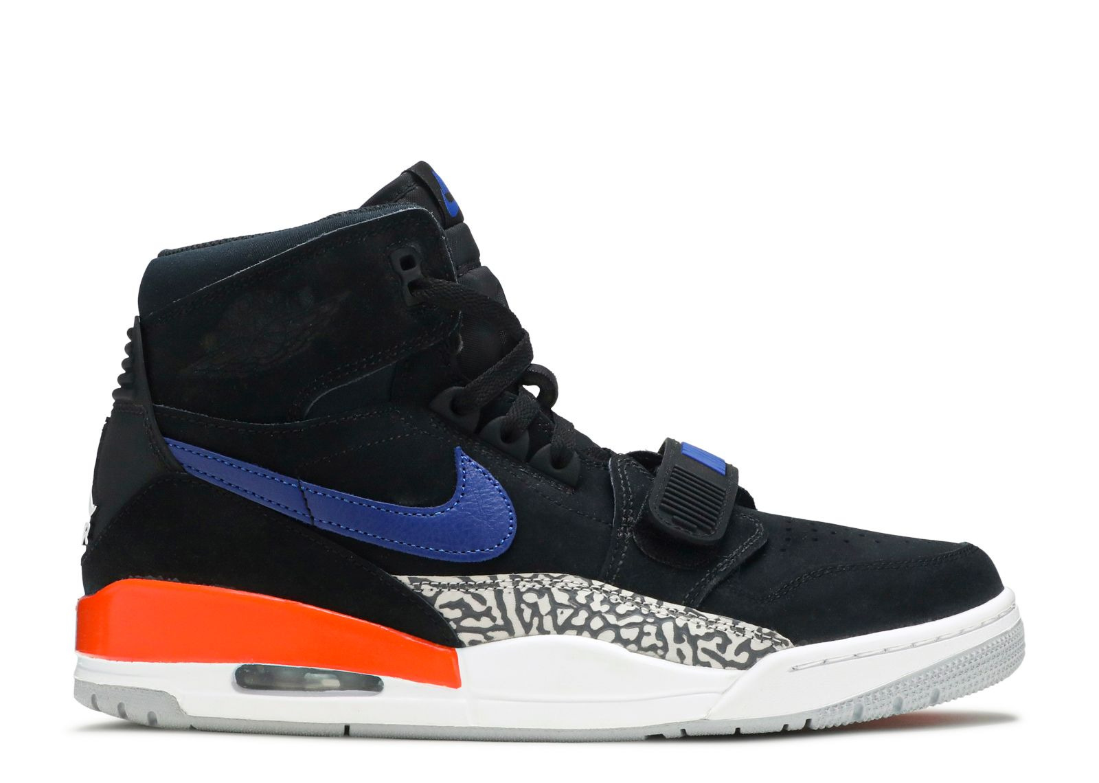 The Jordan Legacy 312 ‘Knicks’ gives the nod to Michael’s Eastern Conference rivals, who memorably clashed with the Bulls throughout the ‘90s NBA postseason. The mid-top sports a black nubuck upper, accented with royal blue on the Swoosh and Brilliant Orange on the midsole. The shoe’s traditional Knickerbocker hues are complemented by Jordan’s iconic elephant print on the side-panel overlay. SKU: AV3922 048 Colorway: Black/Rush Blue-Brilliant Orange Release Date: 10/26/18