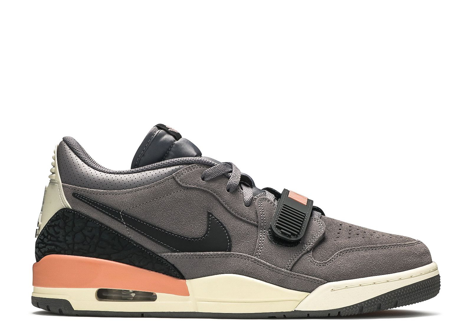 The hybrid look of the Jordan Legacy 312 gets an elevated construction with the Jordan Legacy 312 Low 'Gunsmoke.' Taking elements from the Air Jordan 1, Air Jordan 3 and Nike Alpha Force, the shoe's upper is built with suede, finished in Gunsmoke and supported by a black midfoot strap. The heel includes a black elephant print overlay, while the Air midsole includes a Coral Stardust hit. A gunsmoke outsole completes the look. SKU: CD7069 002 Colorway: Gunsmoke/Coral Stardust Release Date: 8/15/19
