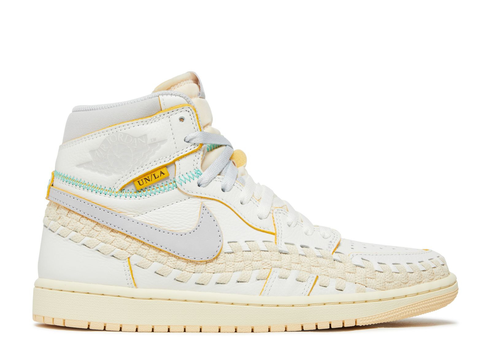The Air Jordan 1 Retro High OG SP collaboration among Union LA, Bephie’s Beauty Supply, and Jordan Brand, offers a fresh take on the classic silhouette. It features a white leather upper with exposed stitching in green, woven detailing inspired by the Nike Air Footscape Woven and a grey Swoosh. The shoe's traditional lines are accented with yellow trim and match the laces and a discreet 'UN/LA' label on the lateral ankle. Branding appears via a tonal Wings logo on the collar flap and a woven Nike Air tongue tag. Underfoot, the durable rubber cupsole has a vintage pre-yellowed finish, adding to the retro vibe. SKU: FD2565 100 Colorway: Sail/Wolf Grey/Muslin/Pale Vanilla/Kinetic Green/University Gold Release Date: 8/24/23