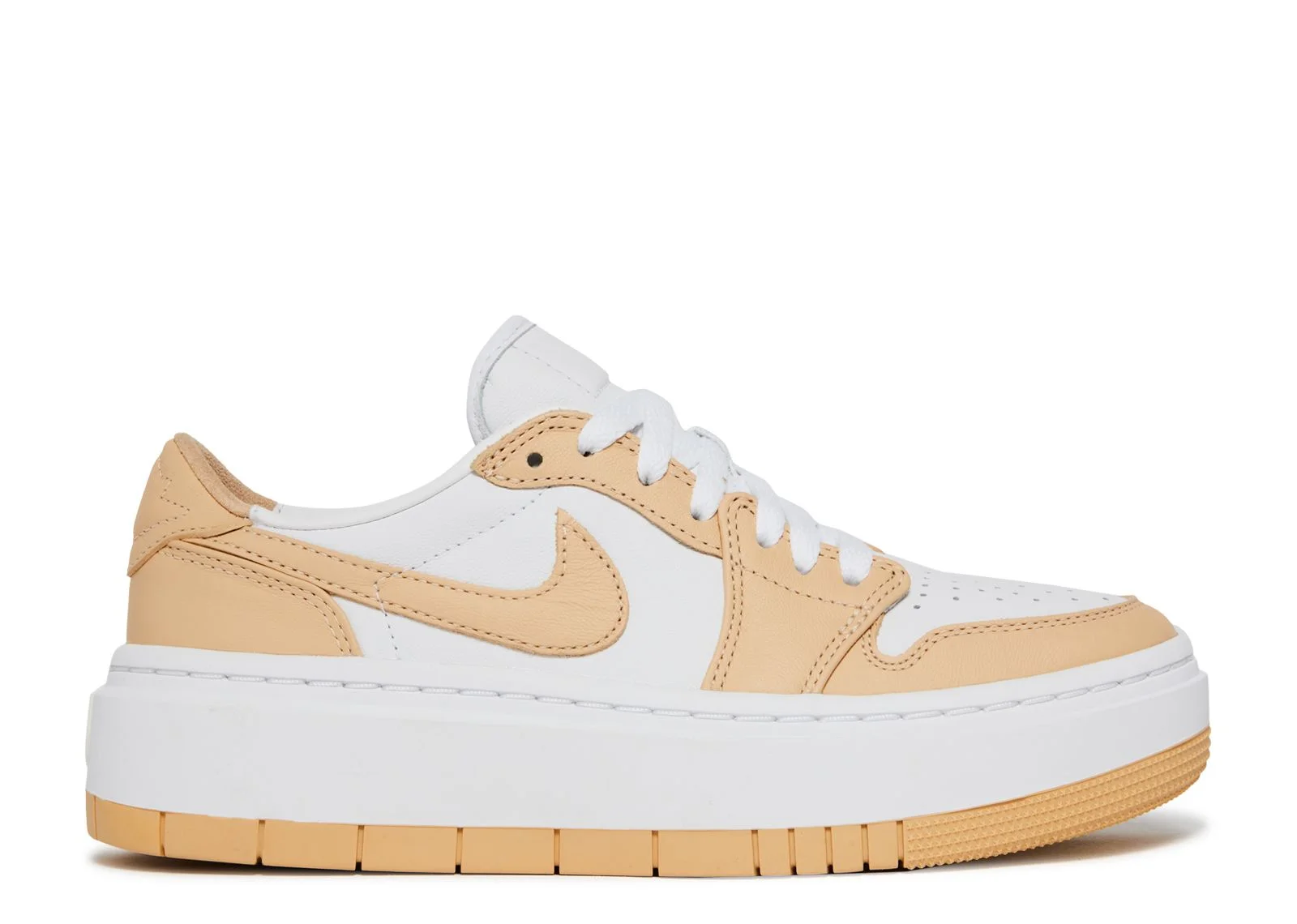 A muted palette and platform midsole distinguish the women’s Air Jordan 1 Elevate Low ‘White Onyx.’ Pale beige overlays appear against the base in white leather. Optimal comfort and support underfoot are delivered by the oversized midsole with an Air-sole unit. The rubber outsole features a traction pattern reminiscent of the original Air Jordan 1. Branding consists of a stitched Wings log on the heel tab while the cork insole is adorned by ‘Nike Air.’ SKU: DH7004 102 Colorway: White/White/White Onyx Release Date: 2/25/22