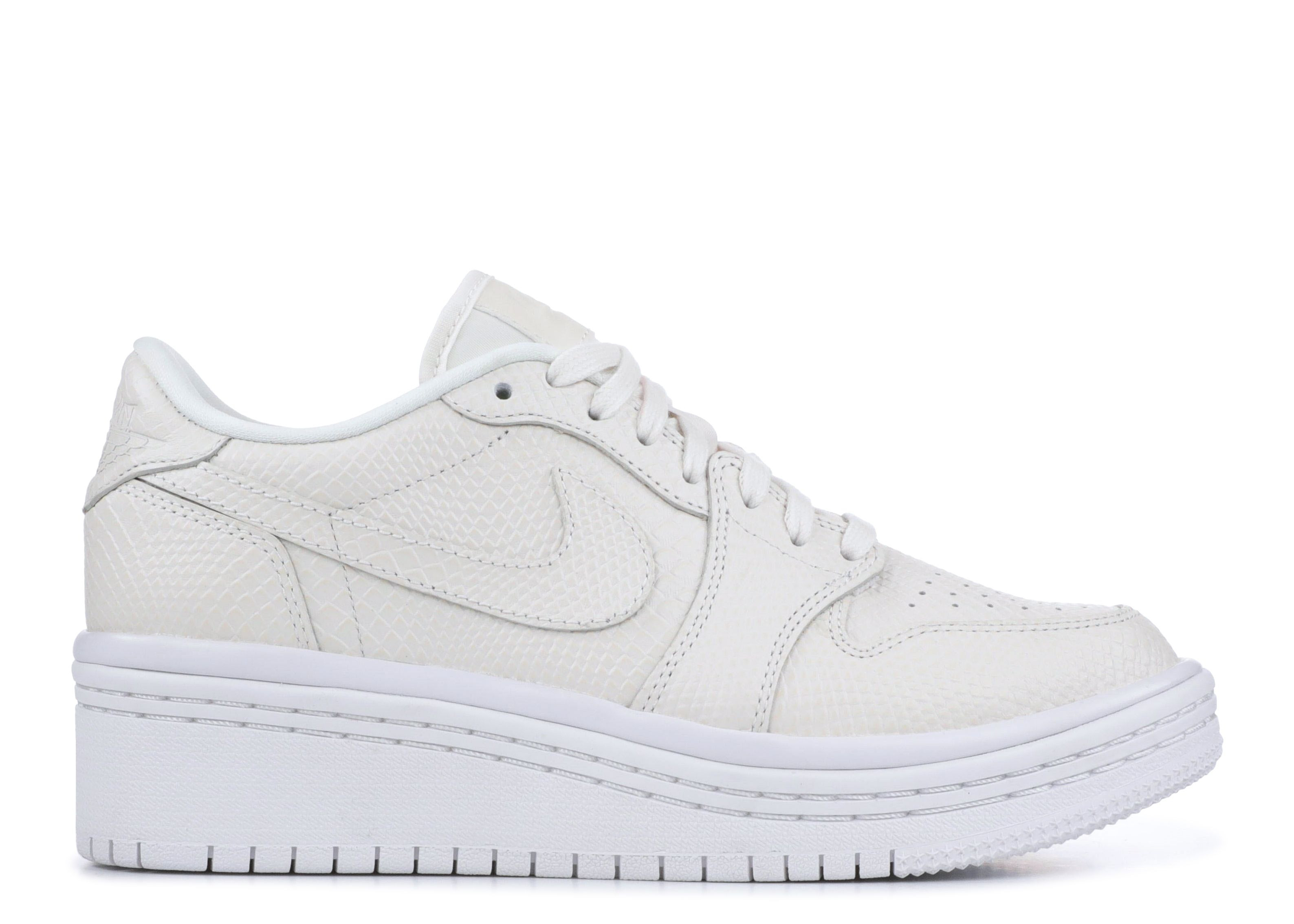 Released in Summer 2018, the women’s Air Jordan 1 Lifted 'White' gives height to the classic silhouette with an elevated wedge heel that conceals the cushioning Air unit. The leather upper and Swoosh boast faux snakeskin and signature logos can be seen on the tongue and heel. SKU: AO1334 004 Colorway: Phantom/White-Phantom Release Date: 6/8/18