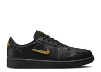 The Women's Air Jordan 1 Low Method of Make 'Black' sports a black leather upper decorated with large stitched details on the forefoot and heel. A metallic gold Swoosh embellishes the quarter panel, matching the molded Wings logo on the heel tab and an 'Air Jordan' signoff on the tongue. A pink rubber cupsole houses an Air-sole heel unit for a plush feel underfoot. SKU: FN5032 007 Colorway: Black/Metallic Gold Release Date: 7/20/24