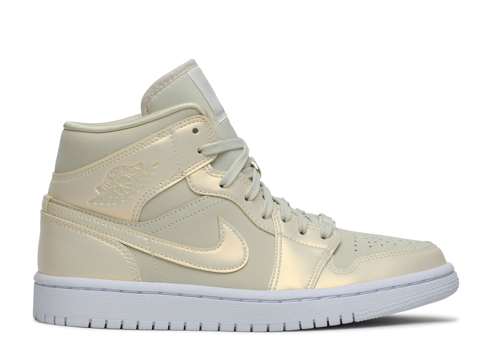 The Nike Women's Air Jordan 1 Mid evokes a nostalgic feel in this modern presentation imbued with meaningful icons. Released in October 2019, this women's revamp casts the patent leather profile, Swooshes, and Wings logo in a pale Lemon Yellow color. Jumpman badges on the tongue and insole nod to the brand. A white rubber cupsole infused with Air cushioning offers the finishing flourish. SKU: CK6587 200 Colorway: Goose Feather Yellow/Lemon Yellow-White Release Date: 10/13/19