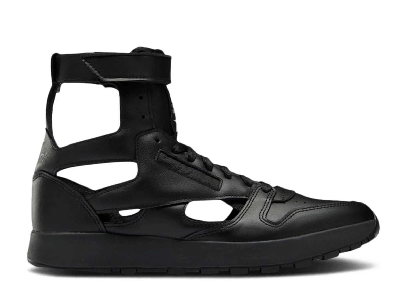 Inspired by gladiator sandals, the Maison Margiela x Classic Leather Tabi High 'Black' is an updated take on the 1983 Classic Leather. Featuring Margiela's cleft toe and decortique technique, the shoe's upper includes an open build throughout the midfoot and collar. The woven tongue tag includes Margiela branding, with the fashion house's signature embroidered on the heel patch in white. A tonal rubber sole unit supports the fit underfoot. SKU: GX5041 Colorway: Black/White/Black Release Date: 6/18/21