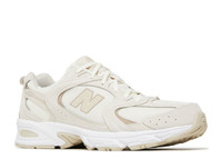 The New Balance 530 'Off White' showcases an ivory mesh with matching synthetic leather and suede overlays. A padded low-cut collar keeps the fit comfortable, while a webbed heel pull tab makes for fast on and off. A lightweight ABZORB midsole partners with a lugged rubber outsole for a comfortable feel and reliable traction. SKU: MR530OW