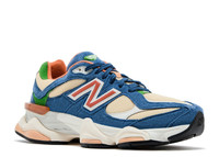 The New Balance 9060 'Blue Beige' has a cream-hued mesh upper with royal blue suede overlays and a contrasting orange 'N' logo. An NB signoff adorns the lush green leather back tab, matching the jeweled 9060 emblem on the tongue. A dual-density ABZORB midsole contains a diamond-patterned rubber outsole below. SKU: U9060LDC Colorway: Blue/Beige Release Date: 5/28/25