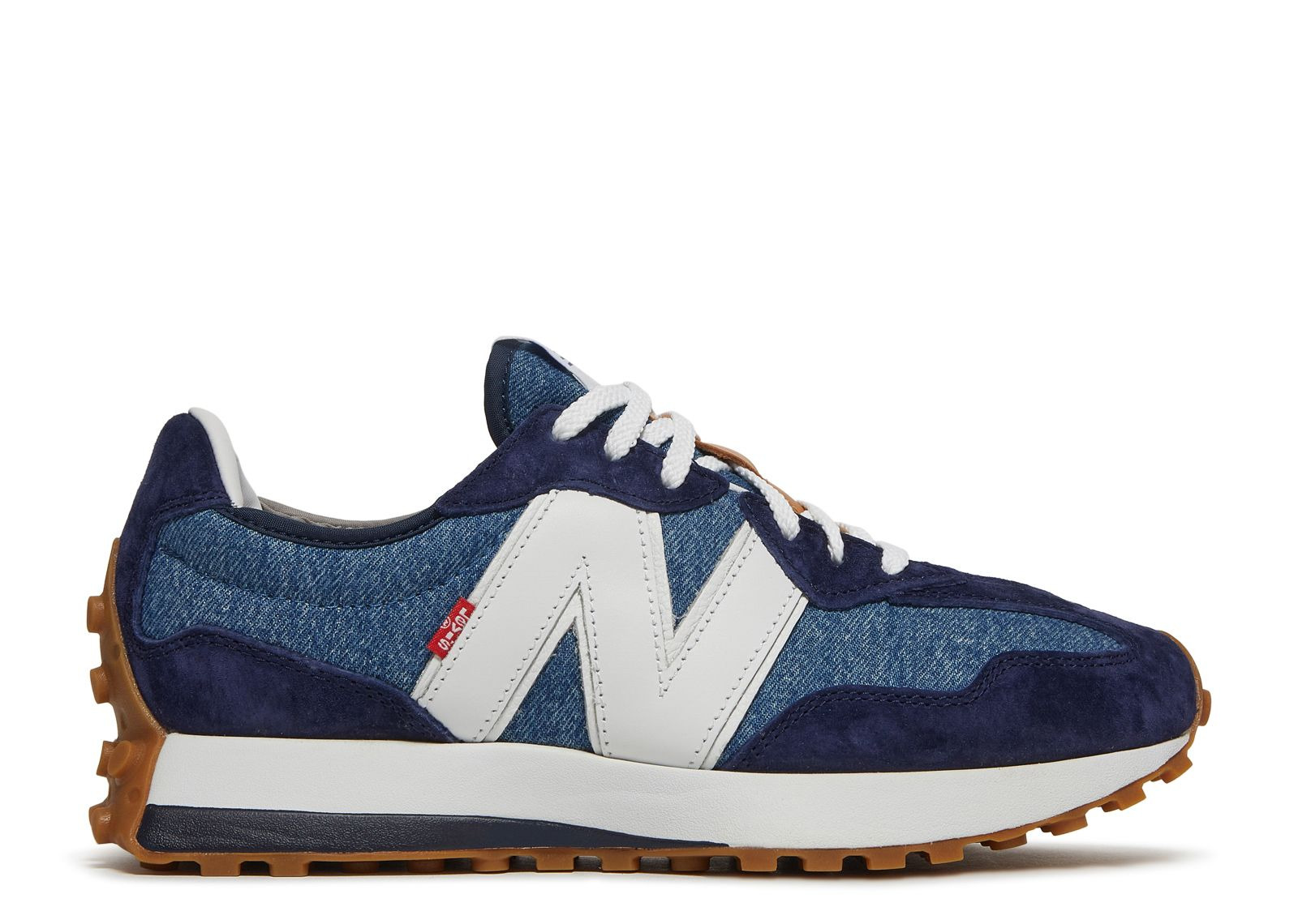 Part of a larger collection with the American heritage apparel brand, the Levi's x 327 'Indigio Denim' released in November 2020. The shoe's lifestyle construction features an asymmetric look, with indigo denim on the lateral side overlaid by suede and black leather on the 'N' branding. The medial side features a white base overlaid by grey suede, forgoing the 'N' logo. Underfoot, the gum rubber outsole includes a prominent studded pattern for traction. SKU: MS327LVA Release Date: 11/10/20