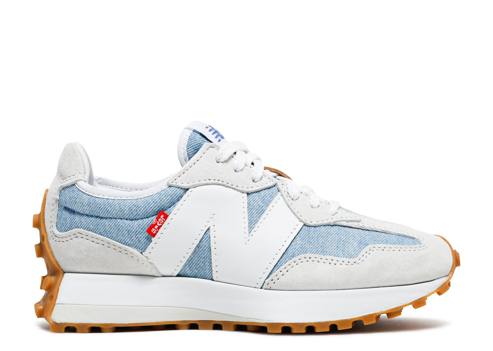 The Levi’s x New Balance women’s 327 ‘Light Wash Denim’ has asymmetric panels on the upper. One side has off-white suede overlays contrasted by light blue denim panels. A large, white ‘N’ logo is accented with Levi’s red tab. The opposite side keeps the same suede overlays, tooled with white knit and denim eyestays. A sturdy gum rubber outsole keeps you surefooted through the day. SKU: WS327LVA Release Date: 11/10/20