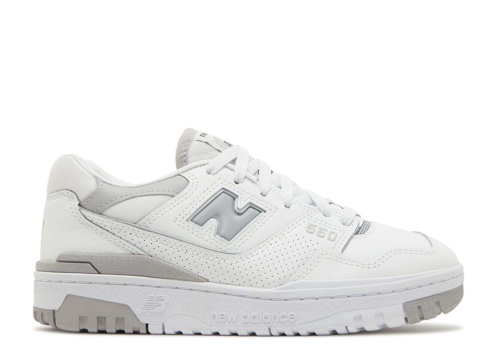 The New Balance Women's 550 'Rain Cloud' is a retro-inspired shoe that combines a sleek, neutral color scheme with a classic design. Light grey accents appear on the white leather upper, including the signature 'N' logo, TPU heel counter, and the padded mesh collar’s leather overlay. The woven tongue tag displays the New Balance 550 branding, and a Flying NB logo adds a touch of style to the back heel. The shoe's durable rubber cupsole is reminiscent of 80s basketball shoes, with an exposed foam wedge on the medial side providing additional support. SKU: BBW550BB Colorway: White/Rain Cloud Release Date: 4/6/23