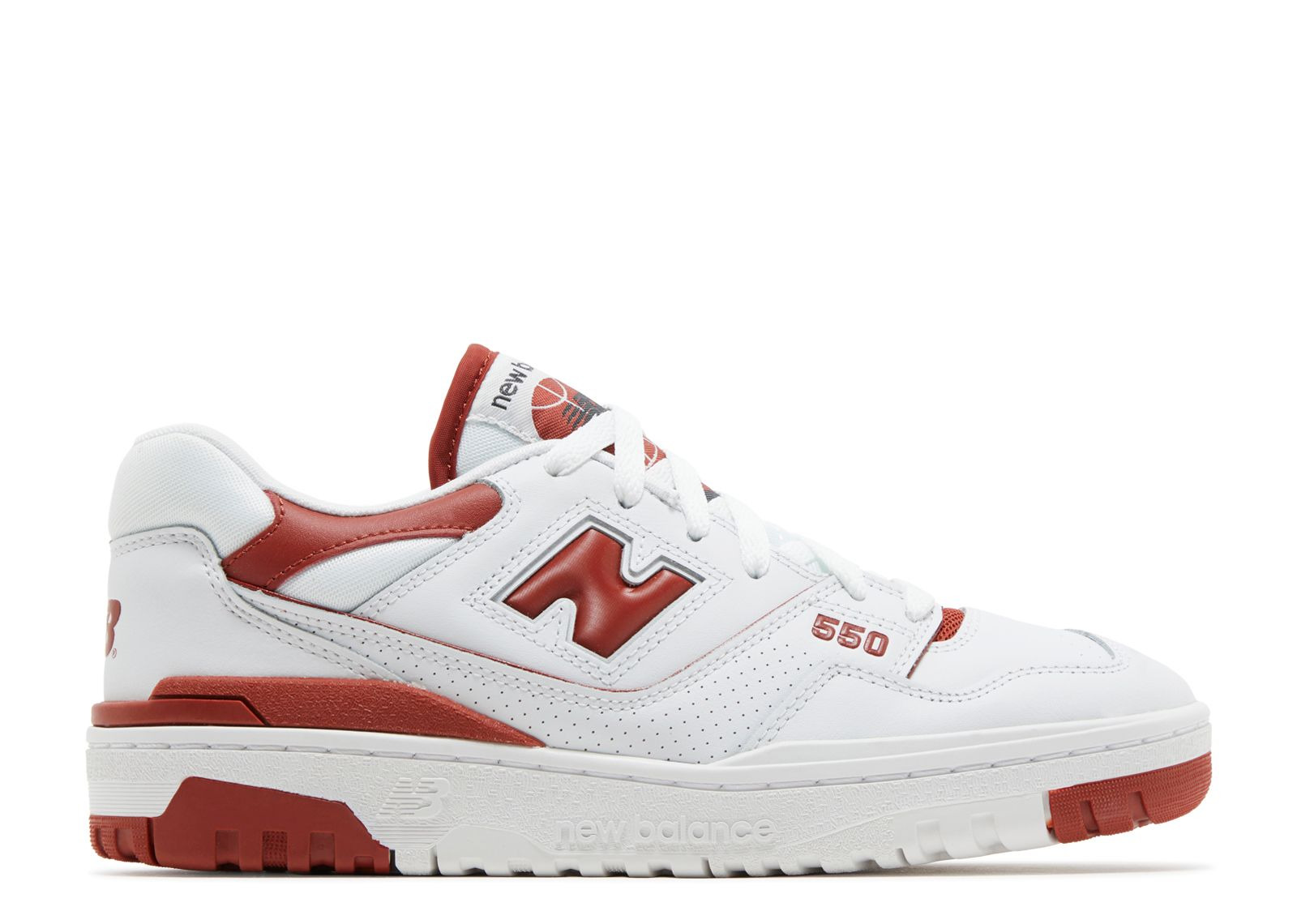 The New Balance Women's 550 'White Brick Red' is infused with a '80s basketball aesthetic whose white leather upper with padded mesh collar is accompanied by a microperforated midfoot overlay outlined with dark crimson piping. The deep red hue is repeated on the TPU heel clip and the quarter panel 'N' logo. The durable rubber cupsole featuring a foam wedge and stitched sidewall construction ensures comfortable strides. SKU: BBW550BR Colorway: White/Brick Red Release Date: 6/21/23
