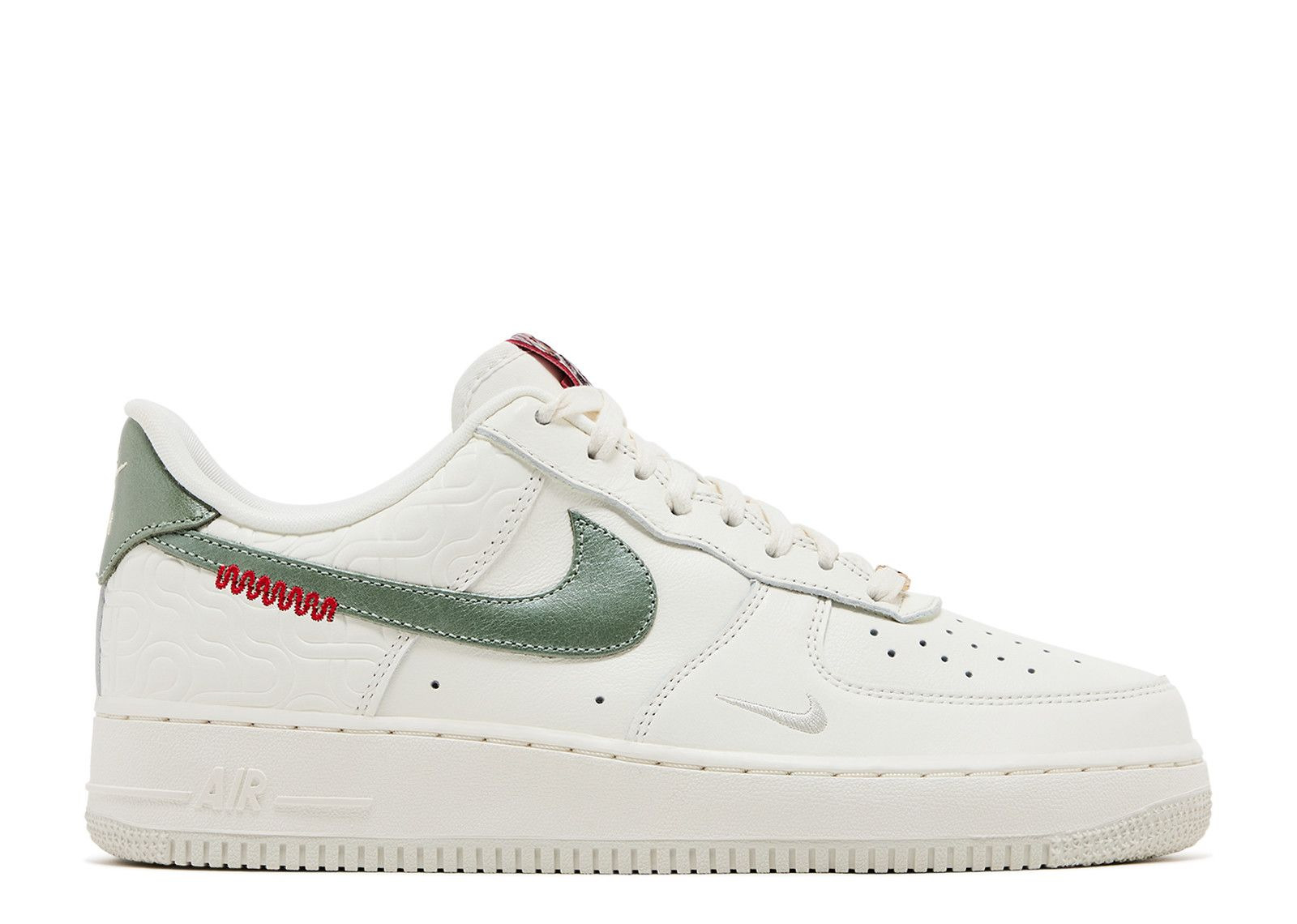 The Nike Air Force 1 '07 LE 'Year of the Snake' rocks a Sp[-0ail leather upper with coiled embossed hits on the heel. A green Swoosh matches the back tab, stamped with an embroidered Nike Air logo. A red snakeskin Nike tag appears on the nylon tongue for an exotic touch. These shoes have an off-white rubber cupsole with an encapsulated Air-sole heel unit. SKU: HV5979 130 Colorway: Sail/Jade Horizon/Light Bone/University Red/Metallic Gold/Sail Release Date: 1/14/25