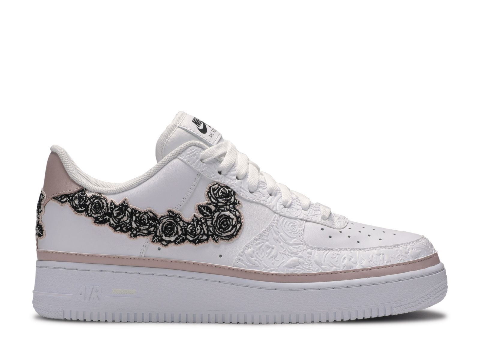 The Nike Air Force 1 '07 LV8, reimagined by cancer patient Zion Thompson for the 'Doernbecher Freestyle' charity collection, released in December 2019. Zion represented her personal style on the sneaker in the form of a white leather upper decorated with roses across the Swooshes and toe box. Soft pink details decorate the heel and along the sidewall. Text reading 'Survivor' emerges on the sockliner and rubber outsole. SKU: CV2591 100 Colorway: White/Stone Mauve/Black Release Date: 12/7/19