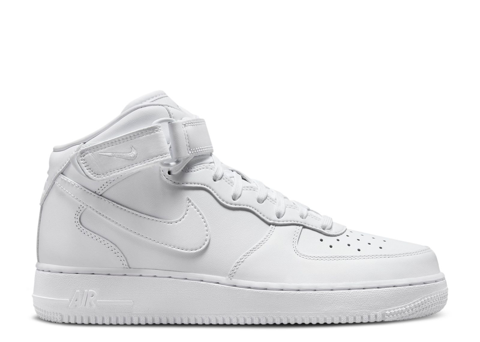 The Nike Air Force 1 Mid 'Fresh,' combines a traditional lace closure with an adaptable ankle strap for optimal fit. The upper itself is fashioned from textured white leather, intentionally designed to mask any creases and facilitate cleaning. Notable Nike branding is debossed on the rear tab and the tongue. The perforated sockliner ensures ventilation, while a rubber cupsole ensures comfort with its lightweight PU-encased Air-sole unit. SKU: DZ2525 100 Colorway: White/White/White Release Date: 8/29/23