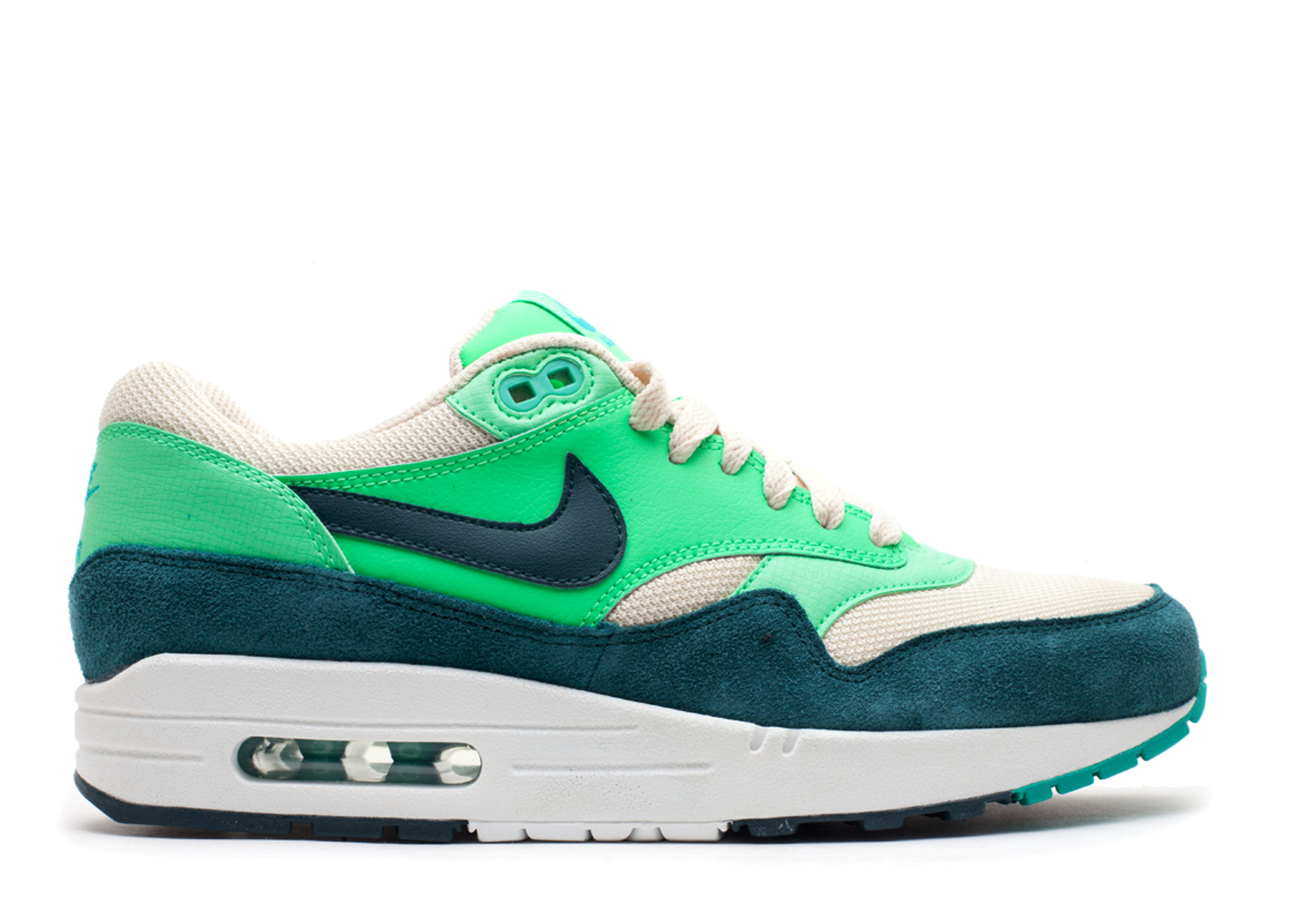 Releasing in 2012, Air Max 1 Essential 'Atomic Green' emerges with a throwback look through its bright upper panels. With Birch mesh underlays providing a neutral base, Poison Green leather brings a pop of color to the look, with Dark Atomic Teal appearing on the suede mudguard. The waffle-traction outsole utilizes both green hues as well as white, while a Sail midsole adds a retro finish. SKU: 537383 230 Colorway: Birch/Dark Atomic Teal/Poison Green/Atomic Teal Release Date: 12/1/12