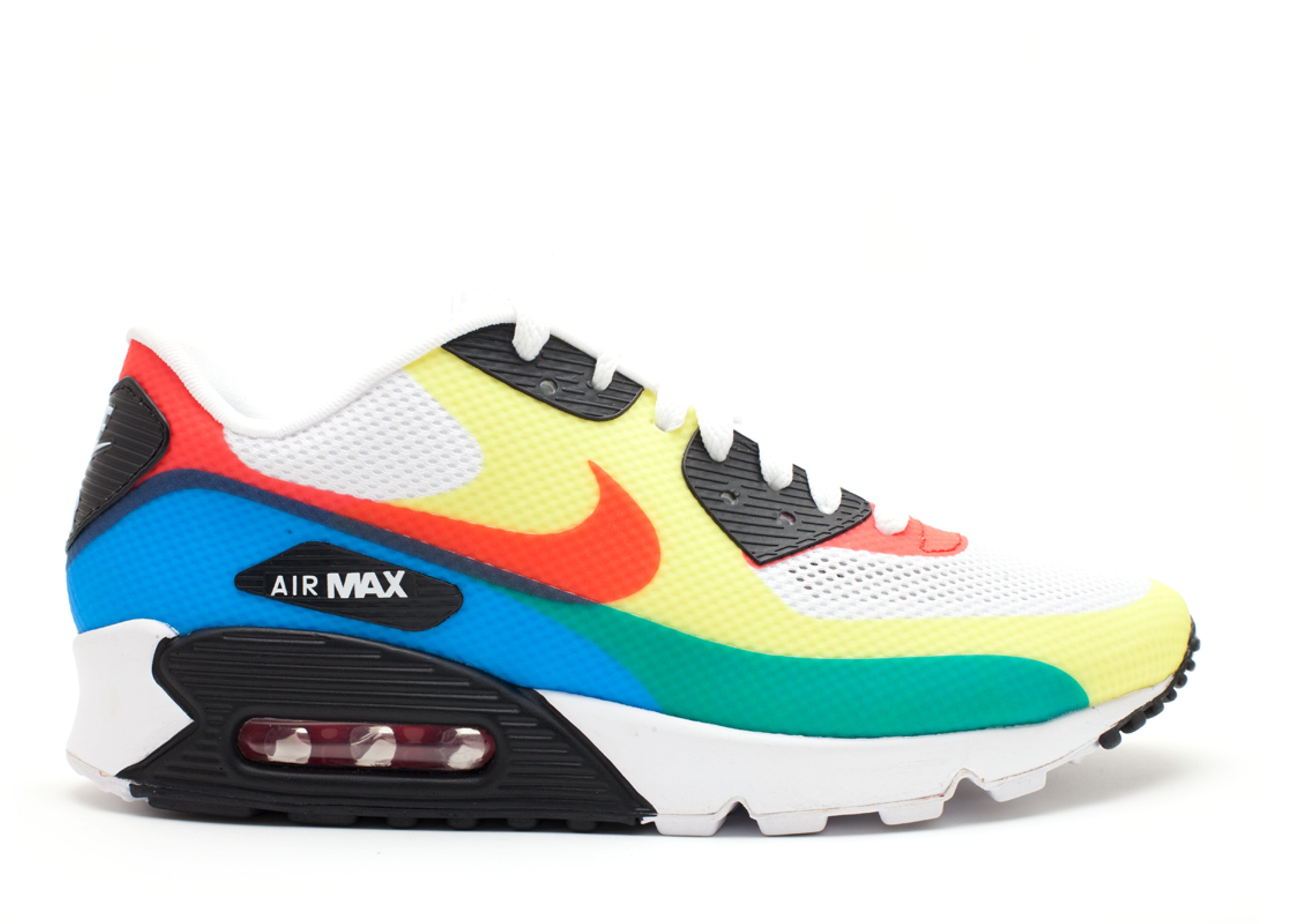 Released as part of a three-pack to celebrate the 2012 London Olympics, the Air Max 90 Hyp Prm Nrg 'What The Max' brings the 'What The' design to the Air Max 90 silhouette. The shoe's white Hyperfuse upper is accented with a mix of yellow, orange, blue and green as a nod to the Olympic rings. Underfoot, more traditional tooling includes visible Air in the heel. SKU: 532306 160 Colorway: White/Sport Red-Soar Release Date: 5/19/12