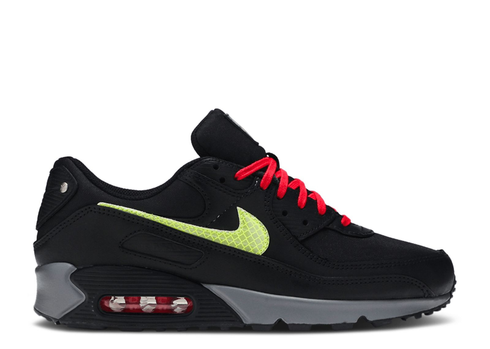 The Air Max 90 'New York - City Pack' released as part of the five-shoe City Pack. Giving the nod to the men and women of the New York City Fire Department, the shoe's upper is built with a black textile base, highlighted by reflective Barely Volt on the stylized Swoosh branding. Screwed-down hardware on the mismatched heel badges is inspired by old firefighter helmets, while the sockliner sports a fire extinguisher graphic and 'The Bravest.' SKU: CW1408 001 Colorway: Black/Red/Barely Volt Release Date: 2/10/20