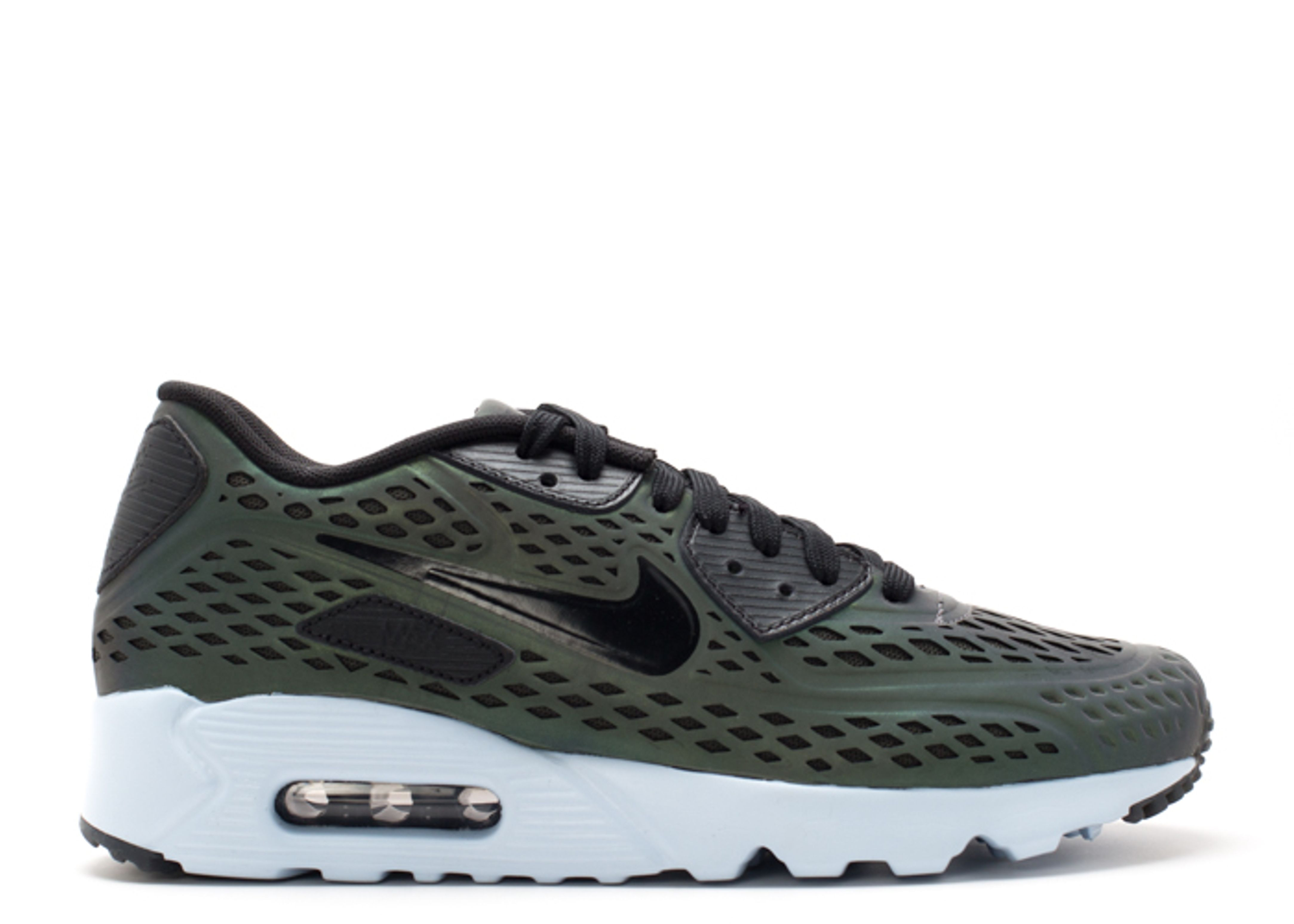 The Nike Air Max 90 Ultra Moire ‘Iridescent’ delivers a sleek and lighter-weight edition of the classic retro runner. Instead of mesh and suede, the upper is built with a one-piece iridescent synthetic shell, featuring cut-out diamond-shaped perforations and a black signature Swoosh. The all-white Nike Ultra sole, cored out for reduced weight, houses a visible Max Air unit for responsive cushioning. SKU: 777427 200 Colorway: Deep Pewter/Black-Porpoise Release Date: 5/16/15