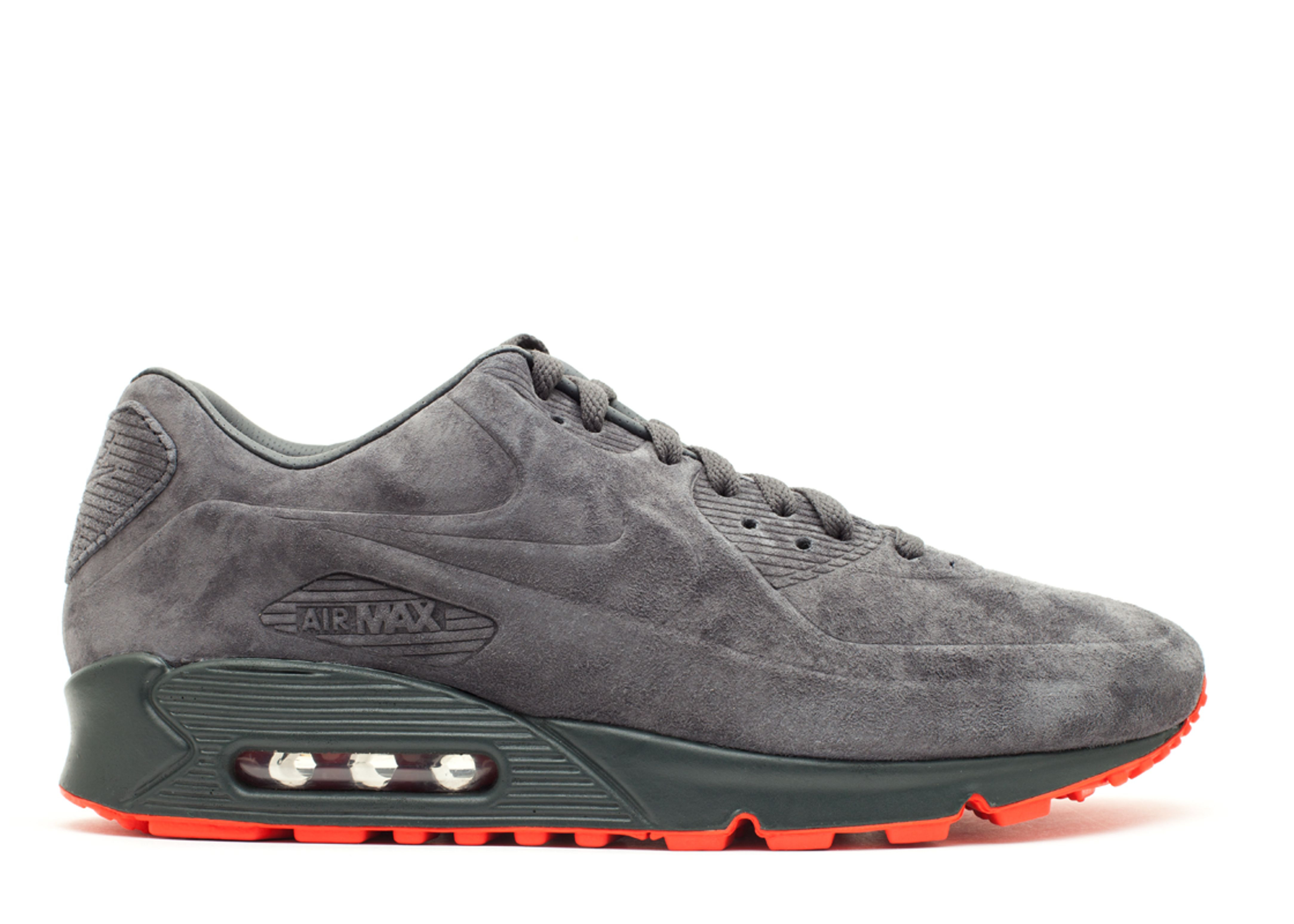 Made using air compression, the Nike Air Max 90 VT are water-resistant shoes without any visible seams or stitching. The 'VT' stands for vacuum technology, consisting of a thermo-molded. grey suede upper with rubber overlays on the heel. A dark olive midsole houses an exposed Max Air unit, while the orange Max outsole adds a bright pop. SKU: 472489 001 Colorway: Anthracite/Anthracite-Max Orange
