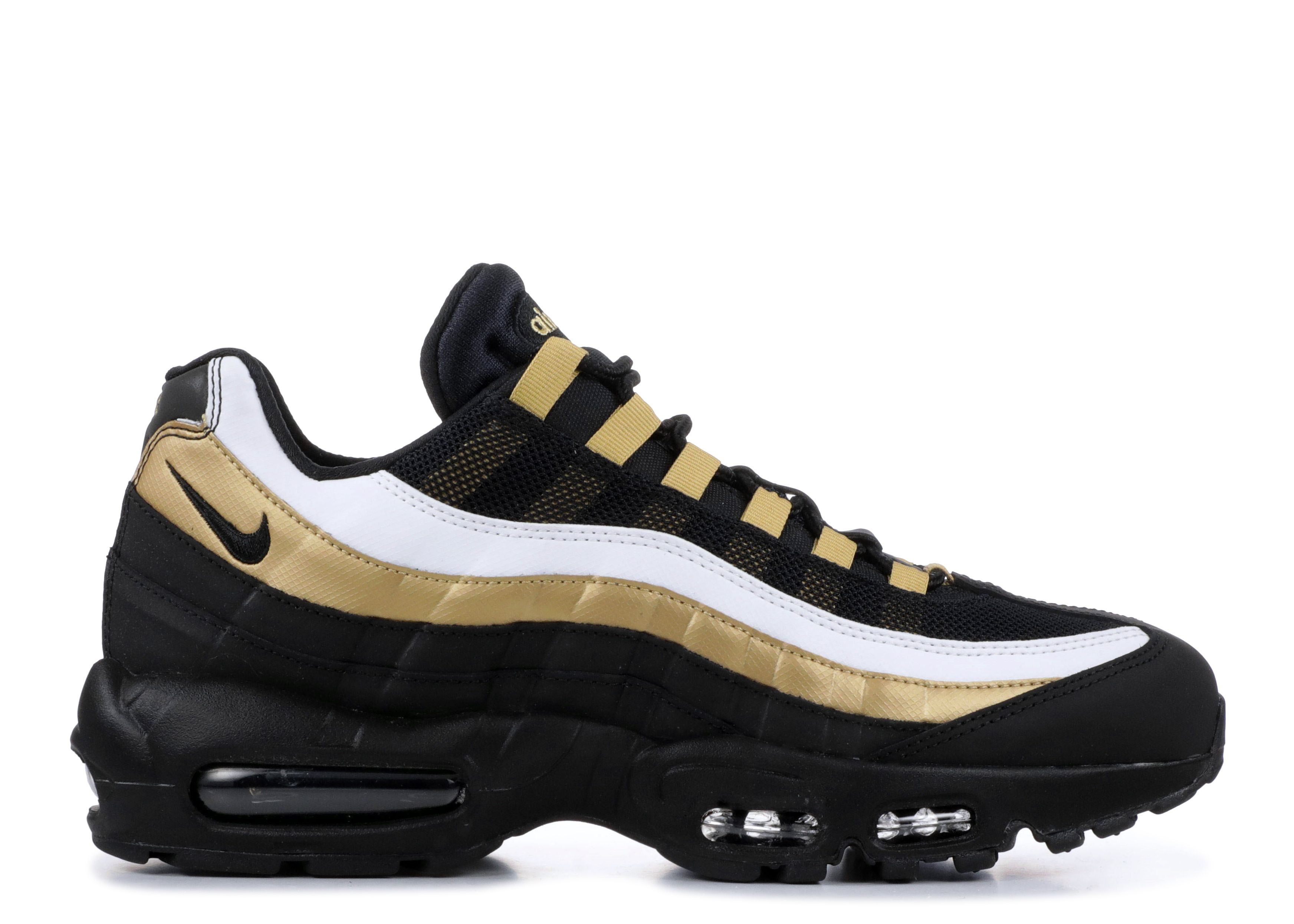 With its November 2018 unveiling, Nike’s Air Max 95 OG was reworked with the ‘Metallic’ pack. The Nike Air Max 95 OG 'Black Gold' sneaker optimizes a leather upper and mesh paneling for ideal support and airflow. The exterior is accented with the Air Max 95's signature wave design. The shoe's foam midsole utilizes visible Max Air cushioning for flexible support, and underneath, the rubber outsole promotes traction and withstands repeated wear. SKU: AT2865 002 Colorway: Black/Black-Metallic Gold Release Date: 11/16/18