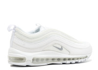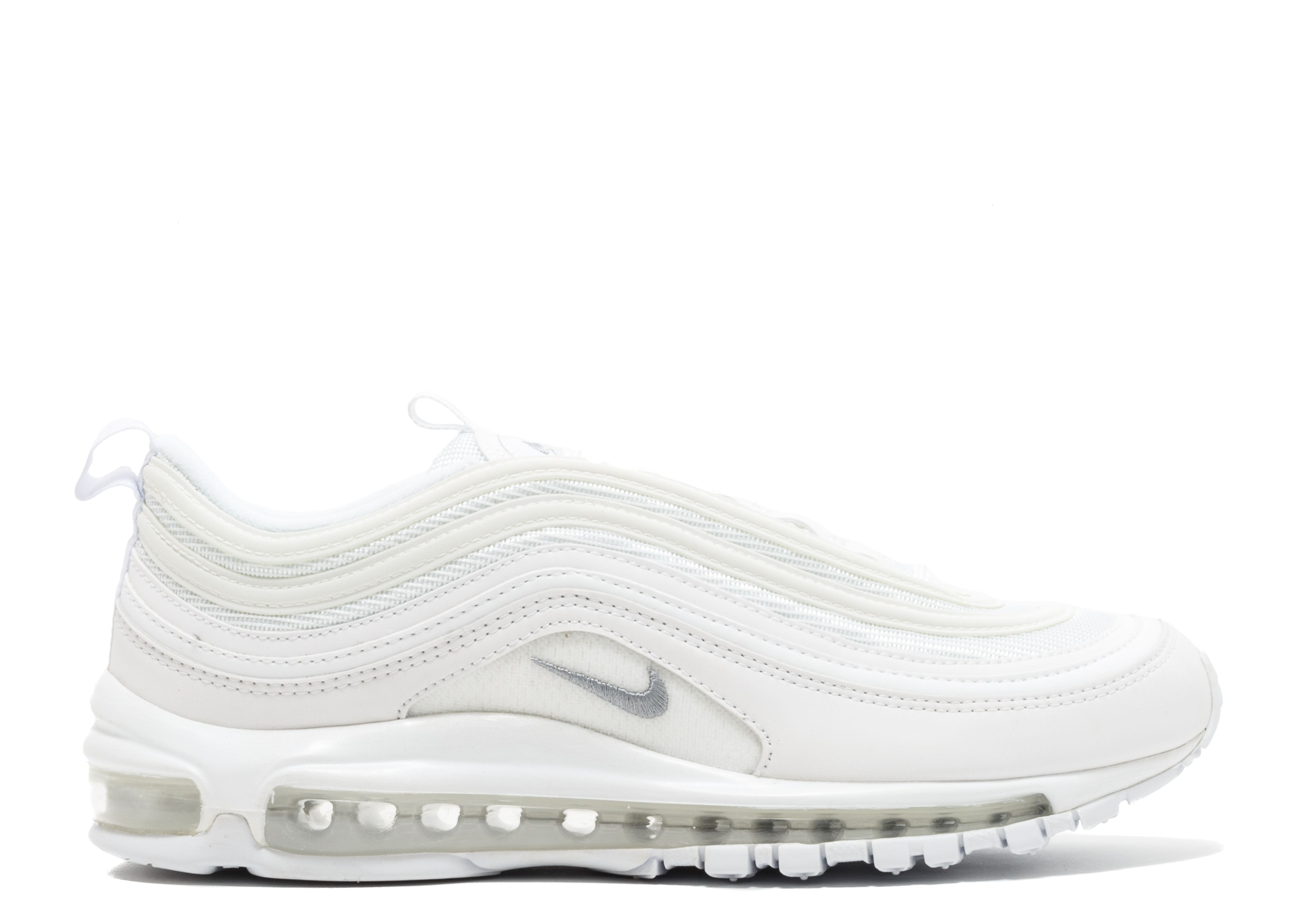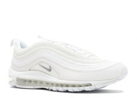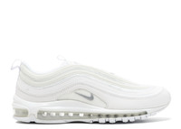 The Nike Air Max 97 'Triple White' strips the classic silhouette of all color, allowing the sneaker’s full-length visible Max Air unit to come to the fore. The upper, inspired by the look of radiating lines created by a water drop in a pond, is built with a traditional blend of mesh and leather. The quarter panel lets in the only hit of contrasting color, arriving on an embroidered mini Swoosh in Wolf Grey. SKU: 921826 101 Colorway: White/Wolf Grey-Black Release Date: 8/1/17