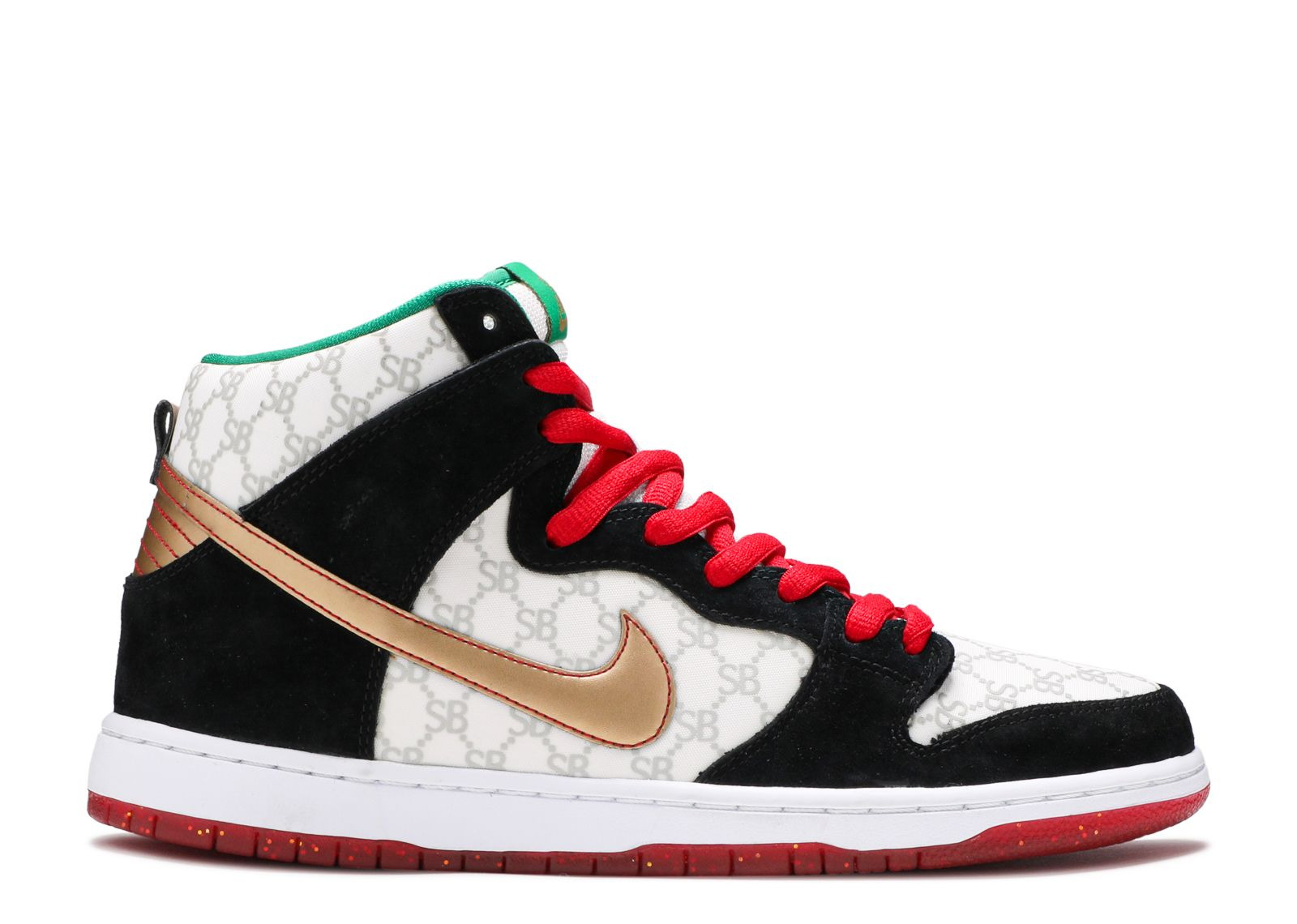 North Carolina skate shop Black Sheep and Nike SB collaborated on the Black Sheep x Dunk High SB 'Paid In Full,' a tribute to Eric B. & Rakim’s seminal 1987 debut album, Paid in Full. The shoe combines green, red and metallic gold throughout its design as a nod to the colors of the ablum cover, while white underlays sporting Gucci-style SB logos and black suede overlays give the nod to the Dapper Dan shirts worn by the hip-hop duo. Shortly before its June 2014 release, the shoe was abruptly canceled by Black Sheep, presumably due to a cease-and-desist letter. SKU: 313171 170 Colorway: White/Metallic Gold-Black Release Date: 1/1/14