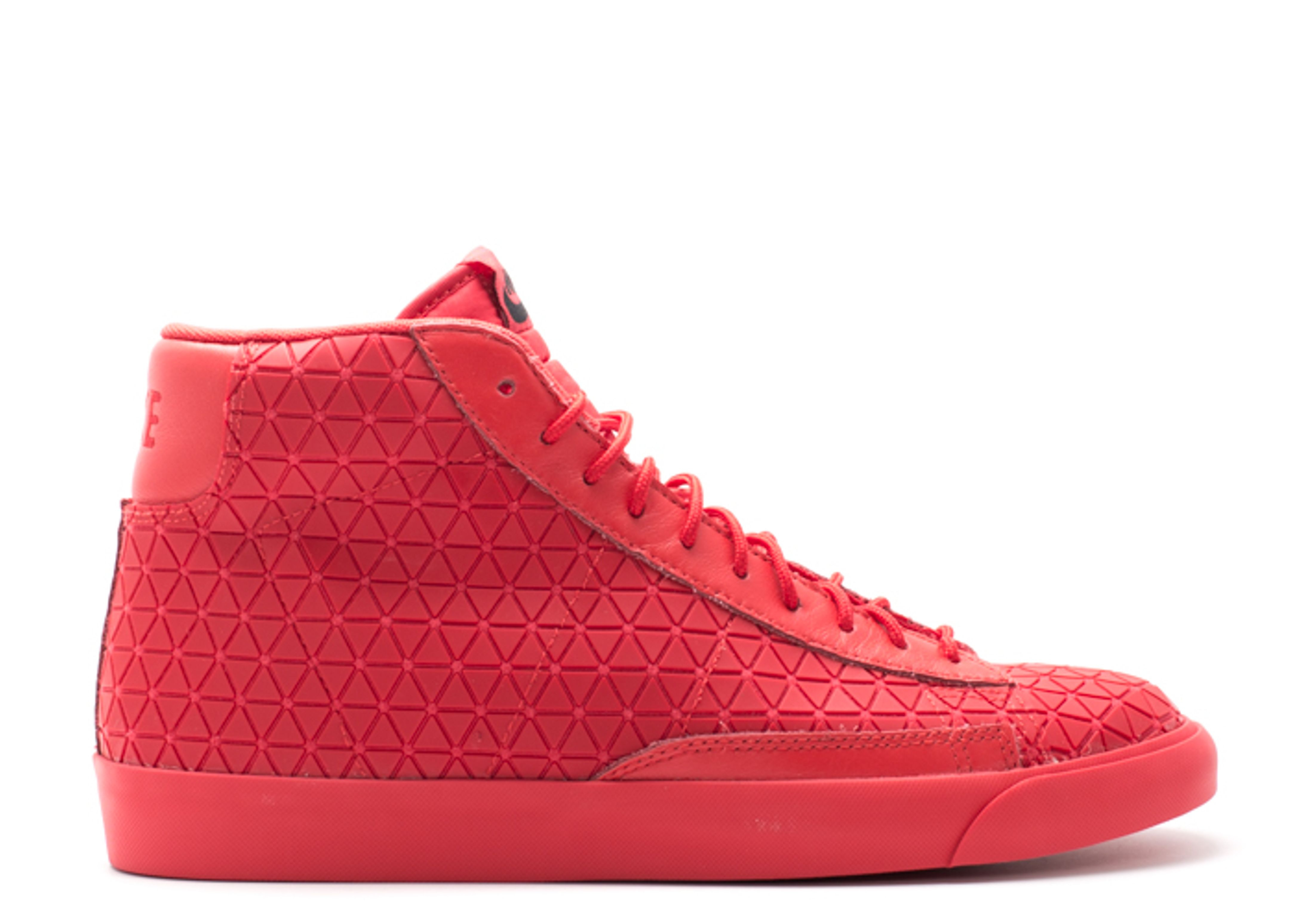 The retro basketball look of the Blazer Mid, which was later adopted by skateboarders, takes on a unique upper design with the Blazer Mid Metric 'University Red.' The all-University Red look is defined by the TPU application throughout the upper that creates a repeating traingle pattern. Leather accents on the eyestay, heel and midfoot panel add textural contrast, white the sole unit continues the monochromatic look. SKU: 744419 600 Colorway: University Red/University Red Release Date: 2/12/15