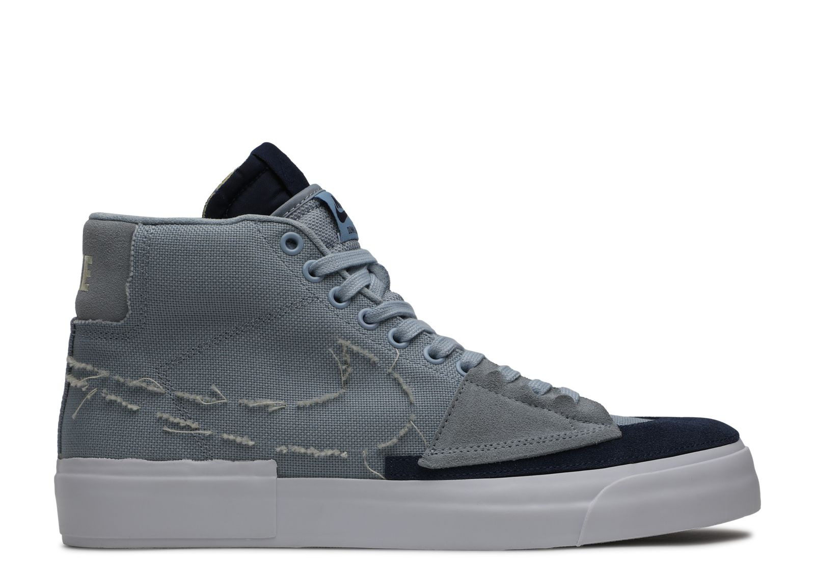 The Blazer Mid SB Edge 'Hack Pack' brings a reconstructed look to the classic skate shoe. Built with canvas, the upper appears in Obsidian Mist, with a Swoosh outline and suede forefoot overlay contributing to the aesthetic. An exposed-foam tongue is layered over a second tongue, while underfoot, the outsole incorporates a herringbone pattern for traction. SKU: CI3833 401 Colorway: Obsidian Mist/Midnight Navy/Fossil Release Date: 2/5/20