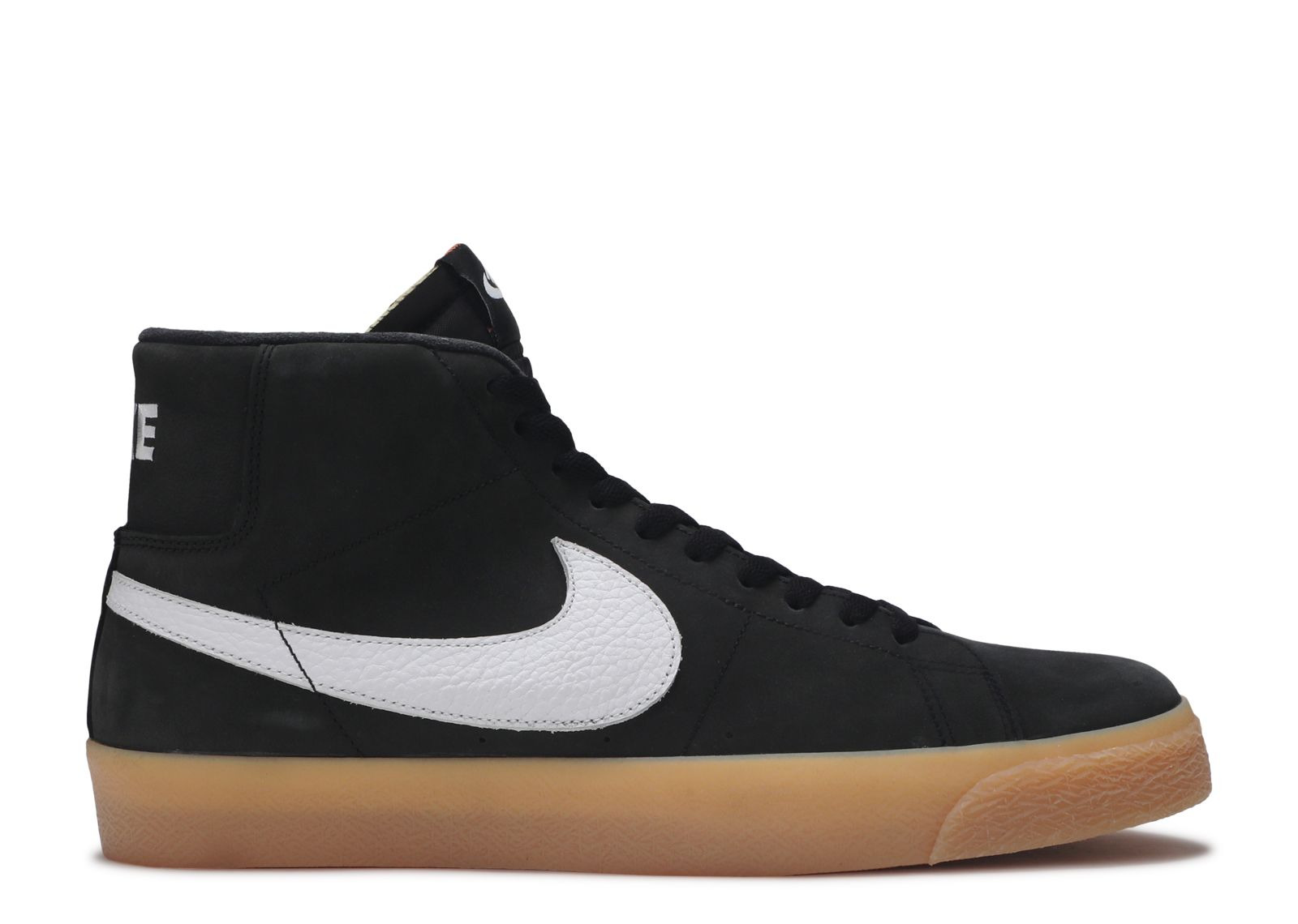 The Blazer Mid SB 'Orange Label' released at select skate shops in March 2019. The shoe's upper is built with black premium nubuck, accented by a white tumbled leather Swoosh, matched by the heel. Underfoot, the vulcanized gum midsole includes a textured toe bumper for support, giving way to a herringbone outsole for traction. The shoe released alongside a Bruin Low. SKU: CD2569 018 Colorway: Black/White-Light Brown Gum Release Date: 3/1/19