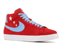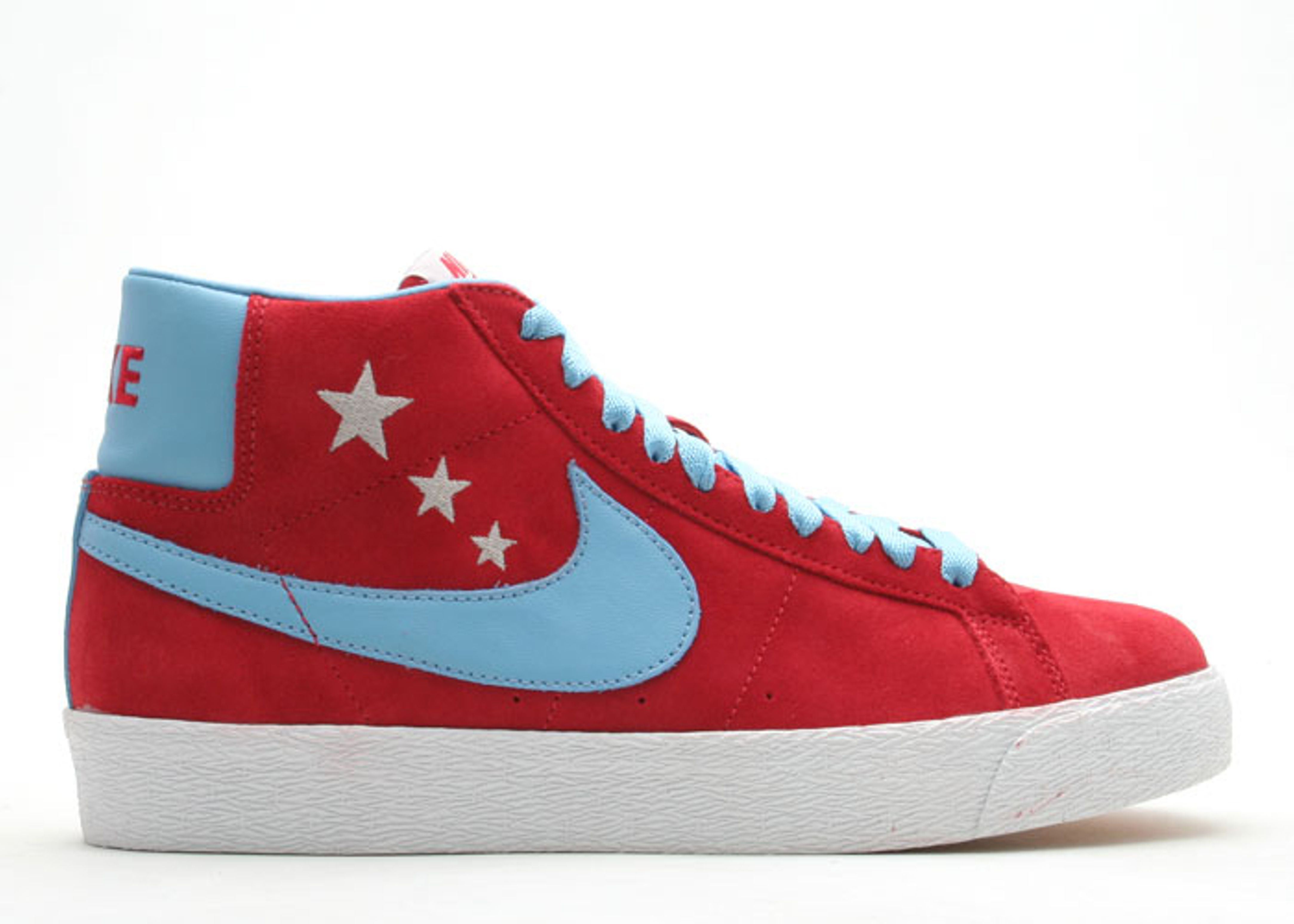 Part of the Nike’s Fallen Heroes pack from 2007 that pays homage to the short-lived careers of artists who fell from grace, the Blazer SB ‘Vanilla Ice’ features a red suede upper with a light blue Swoosh, lacing, and heel tab. For contrast, the special edition sports embroidered white stars and a white textured cupsole. SKU: 314070 641 Colorway: Varsity Red/Blue-Wave Release Date: 1/1/07