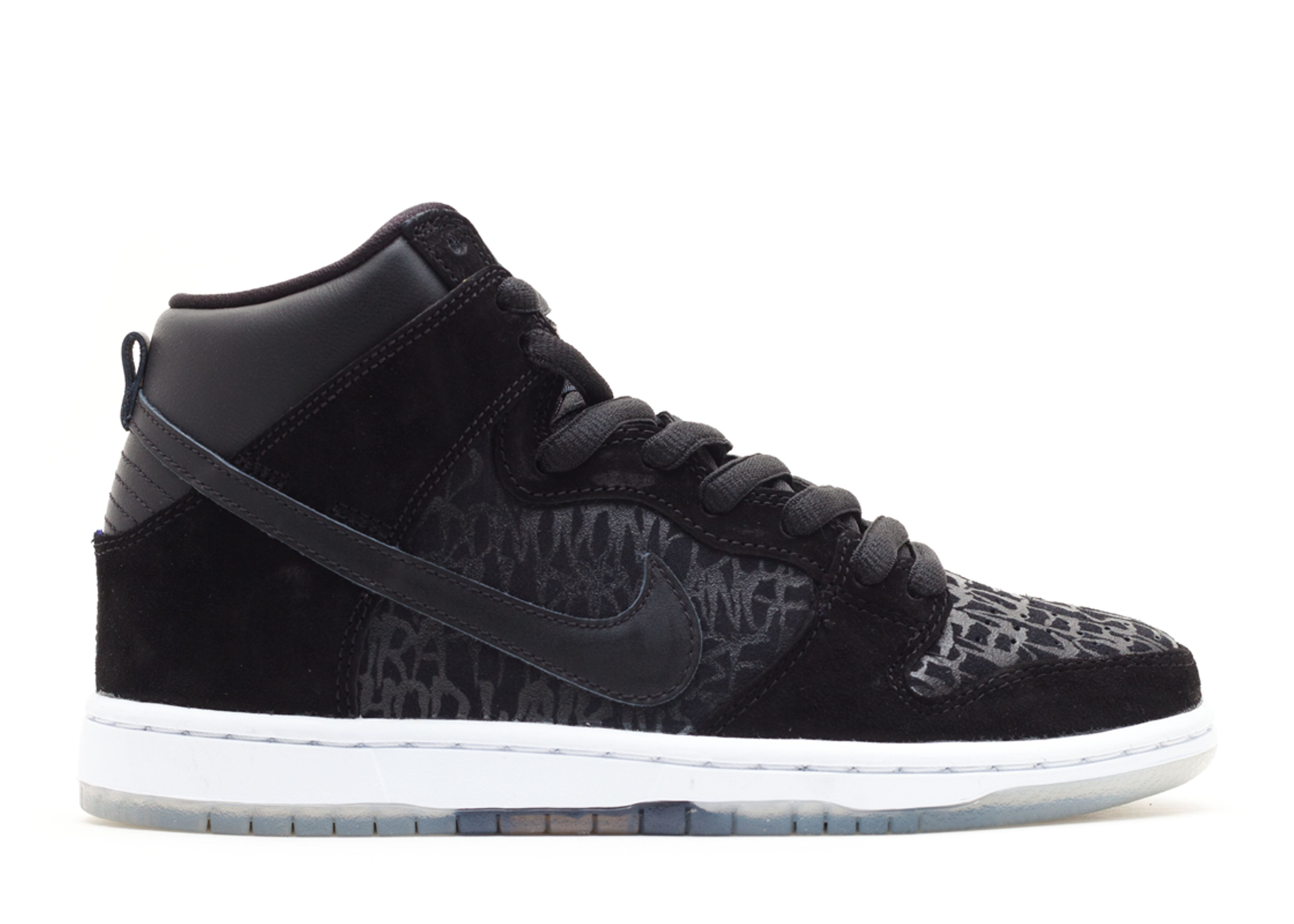 Nike SB tapped graffiti artist Neckface to create the Dunk High Premium SB 'Neckface.' A black and grey offering, the only hit of color on the upper is provided by a yellow tongue tag. The quarter panel and toe box featured a unique written design, while the contrasting white midsole gives way to a translucent outsole. The shoe helped promote the skate film Nike SB Chronicles Vol. 2. SKU: 313171 018 Colorway: Black/Black