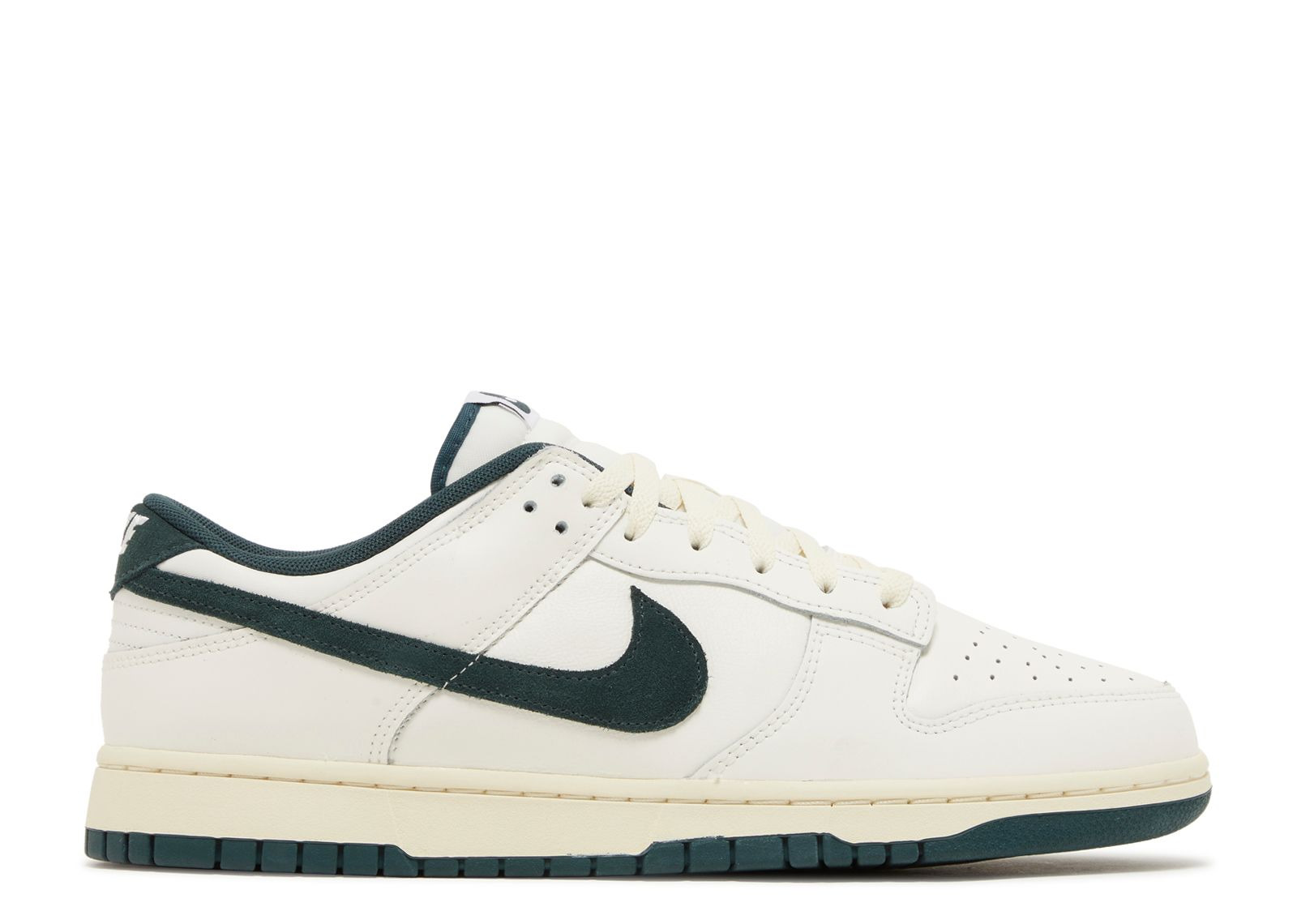 The Nike Dunk Low 'Deep Jungle' is part of the 'Athletic Department' collection and presents an ivory-toned leather upper with the iconic Swoosh and the Nike-branded rear tab appears in lush green suede accents. The sockliner proudly showcases 'Nike Athletic Dept.' branding and the breathable nylon tongue is adorned with a woven Nike tag. The midsole features a vintage off-white look and rests on a green rubber outsole engineered for optimal court traction. SKU: FQ8080 133 Colorway: Sail/Deep Jungle/Coconut Milk/White Release Date: 10/1/23