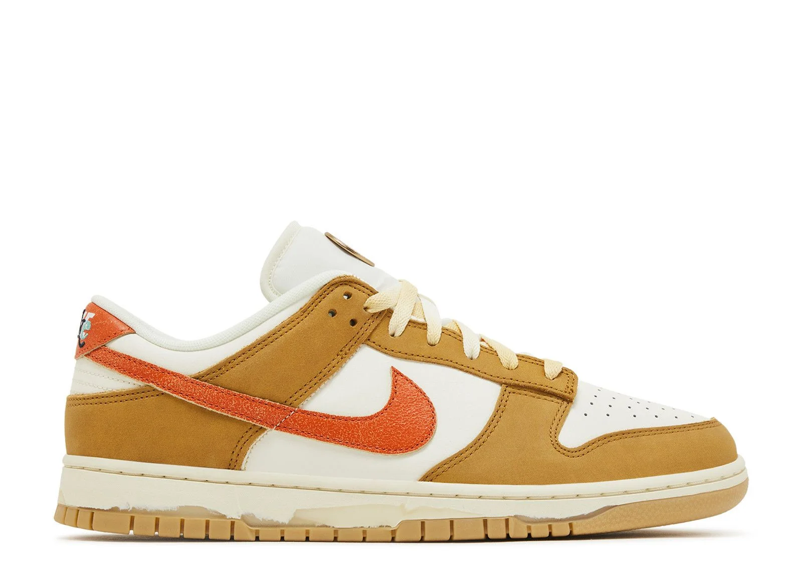 The Nike Dunk Low 'Be the 1' dons an off-white leather upper with tan overlays on the forefoot and heel. Orange pops land on the Swoosh and back tab, which includes a double-exposed Nike logo. A metallic gold badge on the tongue gets a 'Be the 1' signoff, while partially-dyed shoelaces provide a unique look. A vintage off-white midsole is anchored by a classic, gum rubber outsole. SKU: HM3729 181 Colorway: Sail/Coconut Milk/Wheat/Safety Orange Release Date: 9/13/24