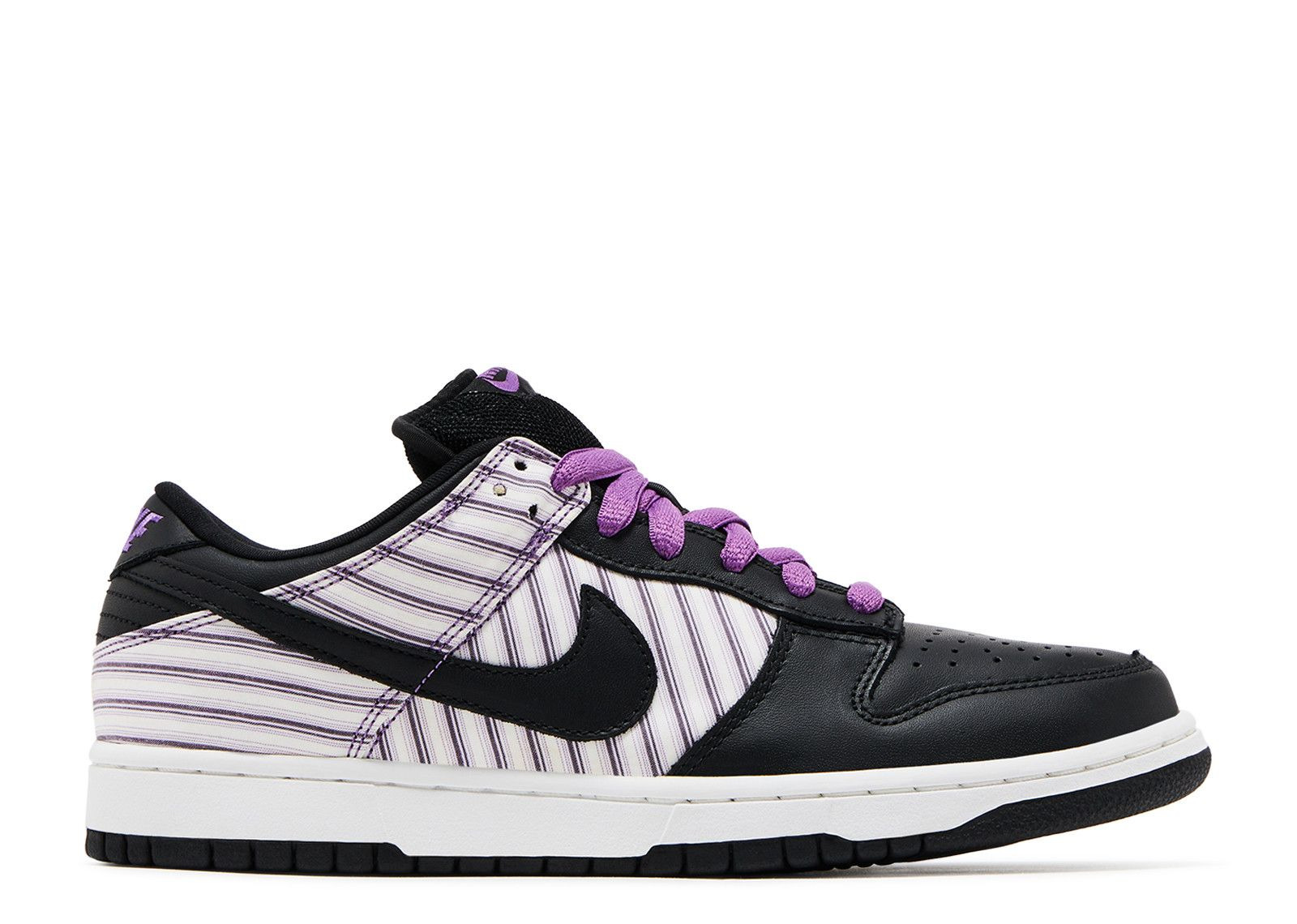 The Dunk Low Pro SB ' Purple Avenger ' published in 2005 in a four-pack influenced by the pinstripe internal liner of sports jackets. This edition involves pinstriped white and purple covers, purple laces and matte black leather on the toe, eyestays, Swoosh, and heel. A white midsole and a black rubber outsole are also featured in the classic low top sneaker. SKU: 304292 101 Colorway: White/Black/Hyancinth Release Date: 6/1/05