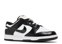 The Nike Dunk Low SE 'World Champ' embellishes the classic two-tone silhouette with decorations influenced by the world of professional wrestling. The low-top sneaker showcases a white leather base with black cracked leather overlays. The upper is accented by a black patent leather Nike Swoosh and embroidered Nike branding in metallic gold. A nod to a wrestling championship belt is found in the form of gold plated lace jewels while a black rubber outsole completes the look. SKU: DR9511 100 Colorway: White/Metallic Gold/Black Release Date: 9/2/22