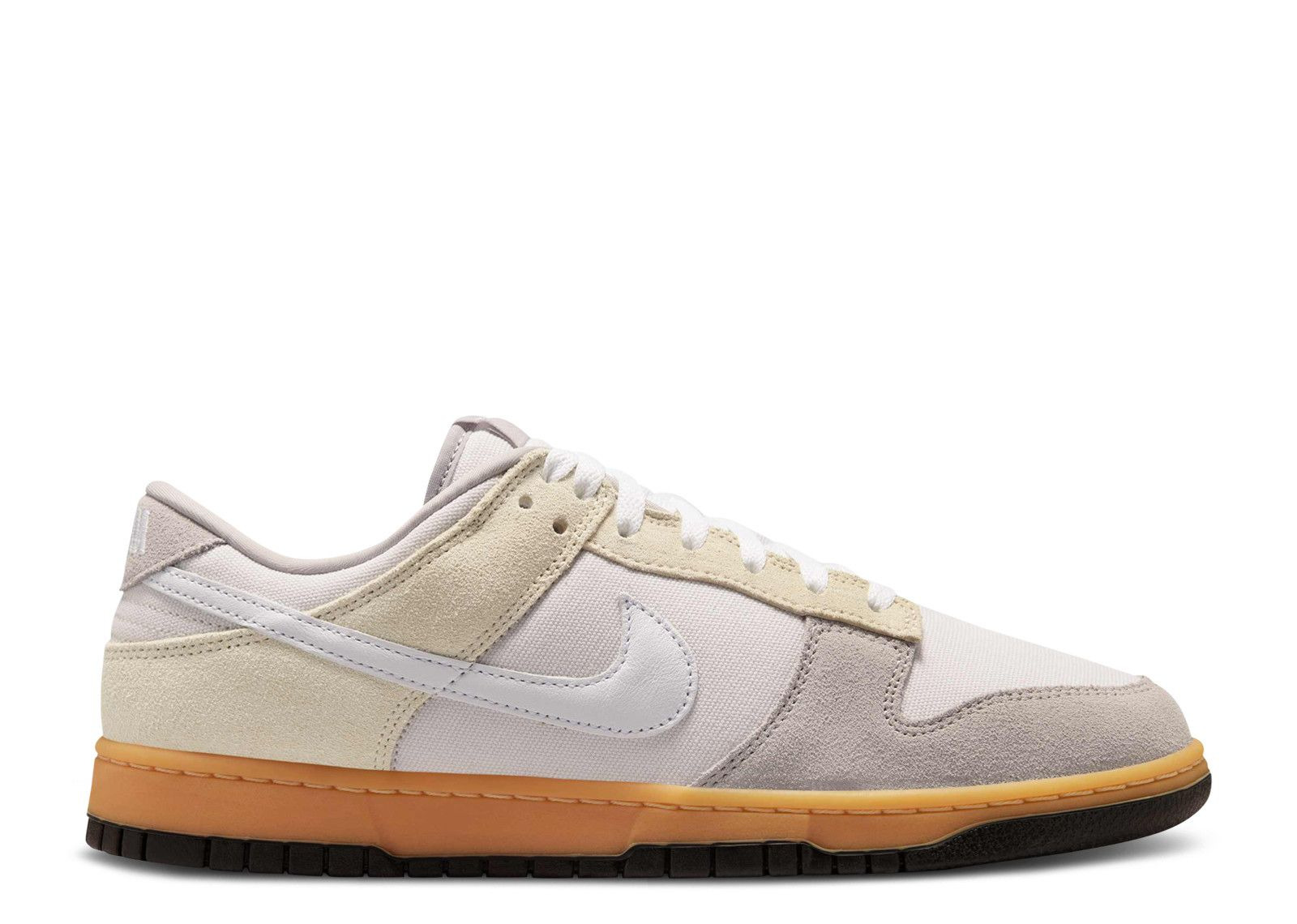 The Nike Dunk Low 'Suede & Canvas' rocks a white leather Swoosh on the off-white canvas supper, bolstered with grey and tan suede overlays. The Nike logo adorns the tongue tag, back tab and insoles. A partially see-through gum rubber midsole gets stitched sidewalls, paired with a black rubber outsole for bold contrast. SKU: HV4301 030 Colorway: Phantom/White/College Grey/Light Khaki/Gum Yellow Release Date: 2/3/25