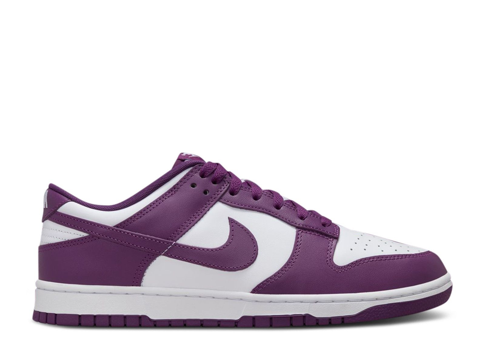 The Nike Dunk Low 'Viotech White' has a white leather upper features accented with violet overlays and a matching Swoosh. A Nike-branded tongue distinguishes the design alongside a Nike wordmark on the back tab. A purple rubber outsole anchors the look, using the same pivot-point traction pattern designed for traction on the court. SKU: DV0833 107 Colorway: Viotech/White Release Date: 7/19/24