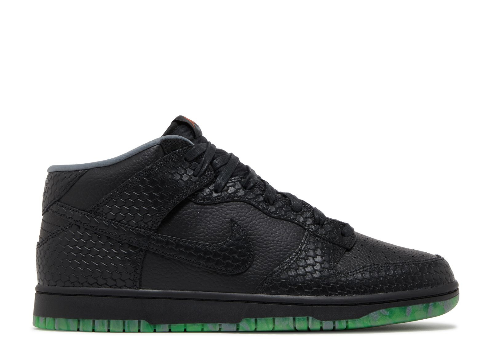 The Nike Dunk Mid Premium 'Headless Horseman' is a Halloween-themed shoe with an embossed snakeskin texture on the eyestay, Swoosh, and forefoot and heel overlay against an all-black leather upper. Haunted forest designs and spooky jack-o’-lanterns embellish the insoles. A black midsole is underpinned with a green tinged glow in the dark outsole. SKU: FQ8749 010 Colorway: Black/Smoke Grey/Campfire Orange/Black Release Date: 10/26/23