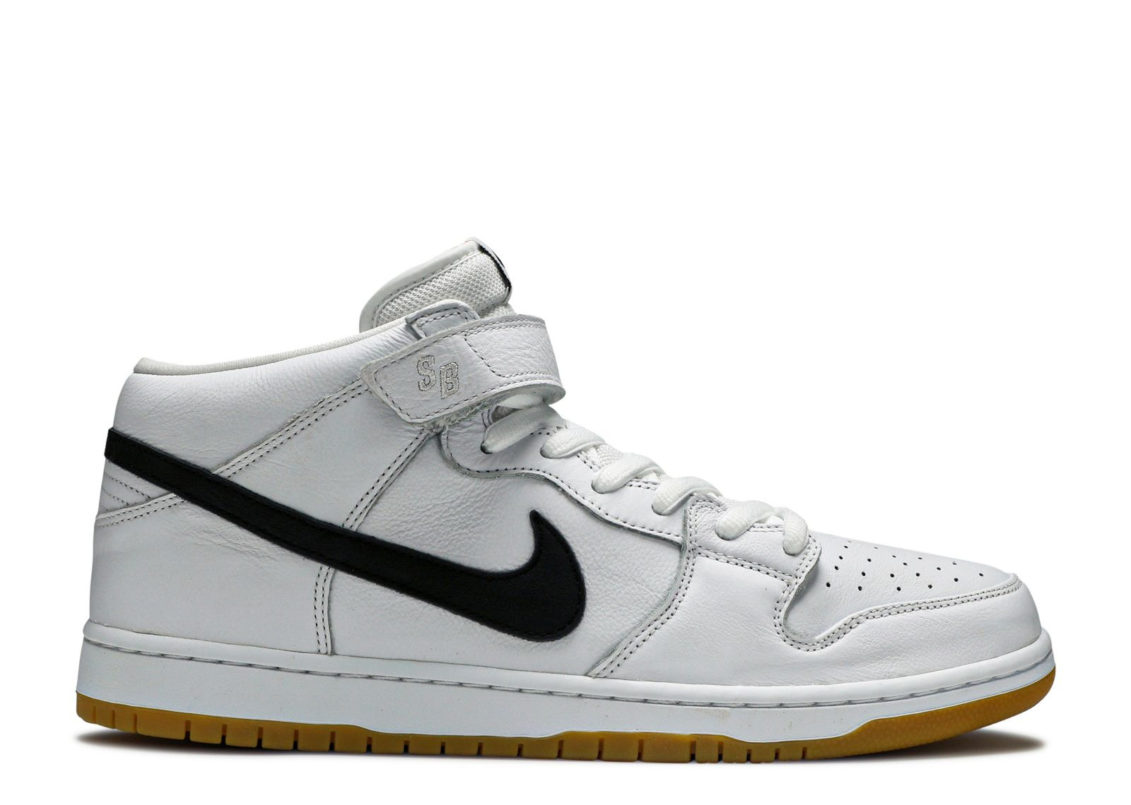 The Dunk Mid SB 'Orange Label' released in June 2019 exclusively at skate shops. The shoe's upper appears in white, supported by a padded collar and tongue as well as a midfoot strap. A black Swoosh contrasts the side wall, while perforations on the toe box provide breathability. Underfoot, Zoom Air in the sockliner provides cushioning, while the gum rubber outsole includes a circular pattern for traction. SKU: CD6754 100 Colorway: White/Black-White Release Date: 6/22/19
