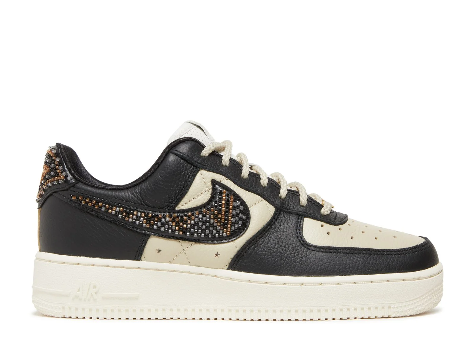 Introducing the first-ever collaboration with Houston's premier sneaker boutique, Premium Goods x Nike Women's Air Force 1 SP 'The Sophia.' The iconic sneaker gets a luxurious upgrade inspired by store owner Jennifer Ford's background in the jewelry industry. The sneaker features a mix of sleek black leather on the eyestay, forefoot and heel overlay and cream-colored tumbled leather on the toe box and quilted quarter panel. Eye-catching beading adds pops of color to the Swoosh and back tab, while the interior is lined with rich black satin. The tongue tag and sockliner display additional Premium Goods branding. SKU: DV2957 001 Colorway: Black/Multi-Color/Sand/Sail Release Date: 1/20/23