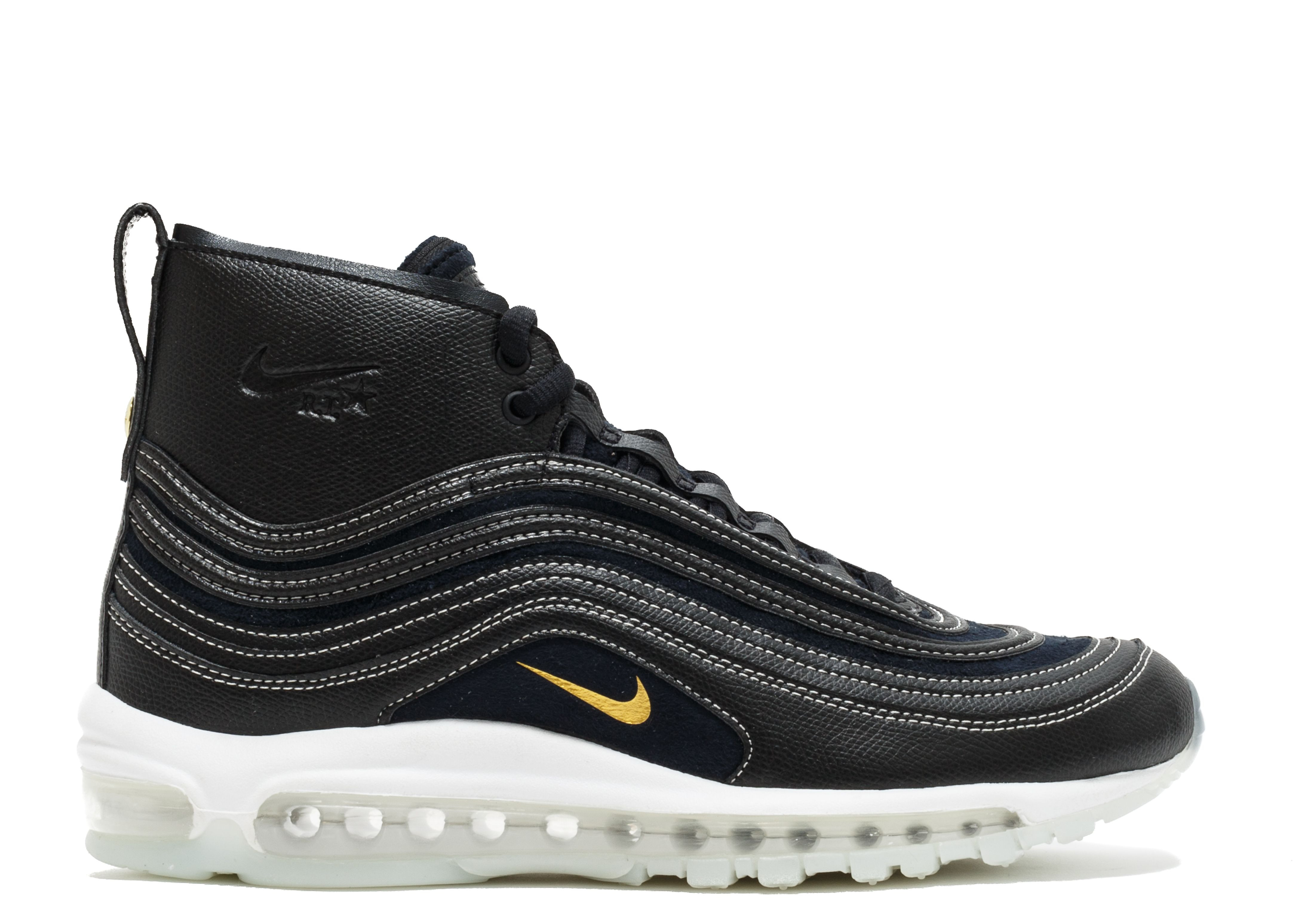 A collaboration between Nike and Riccardo Tisci, the Riccardo Tisci x NikeLab Air Max 97 Mid 'Riccardo Tisci' puts an extended collar on the classic running shoe. Emerging with a black leather and suede construction, white contrast stitching stands out throughout the wavy design. Co-branding appears on the tongue, ankle and heel pull-tab, while a white Max Air unit is included for cushioning. SKU: 913314 001 Colorway: Black/Metallic Gold-Anthracite-White Release Date: 3/26/17