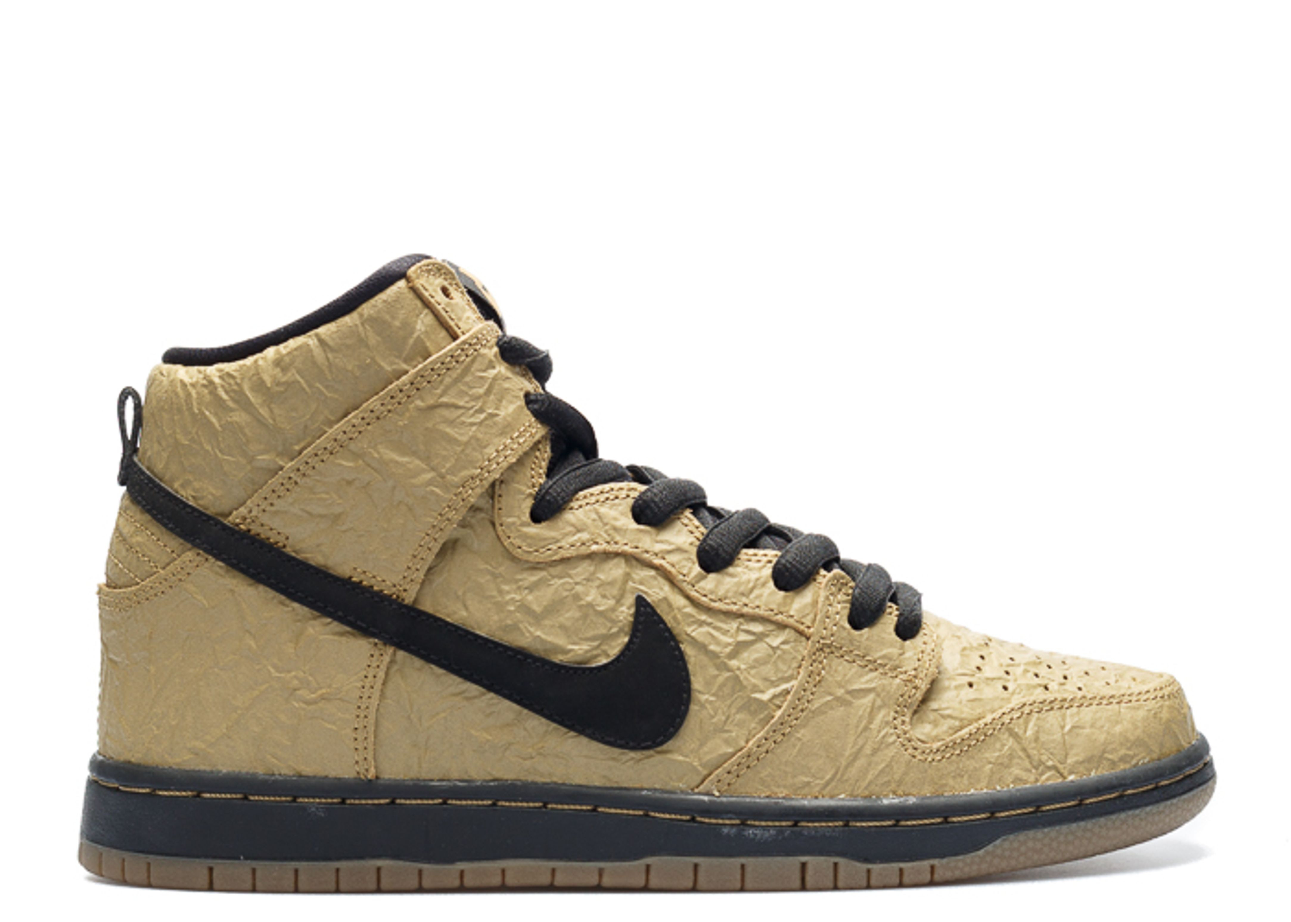 The SB Dunk High ‘Brown Paper Bag’ lives up to its name with a unique crinkled texture on a tan leather upper. The understated hue is accented by black hits on the laces, mesh tongue, collar lining and nubuck Swoosh. A matching black midsole is reinforced underfoot with a grippy gum rubber outsole. Inside, custom artwork on the insoles depict paint splatter effects and a discarded brown paper bag SKU: 313171 202 Colorway: Filber/Black-Gum Dark Brown