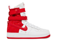 Combining the basketball-centric design of the AF1 with the military style of the Nike Special Field boot, the SF Air Force 1 High 'University Red' boasts a leather and ballistic nylon upper, secured ankle strap and paracord, and circular traction on the outsole. Branding is seen on embossed on the counter, as well as on the tongue, laterals and footbed. SKU: AR1955 100 Colorway: White/University Red/University Red Release Date: 3/2/18