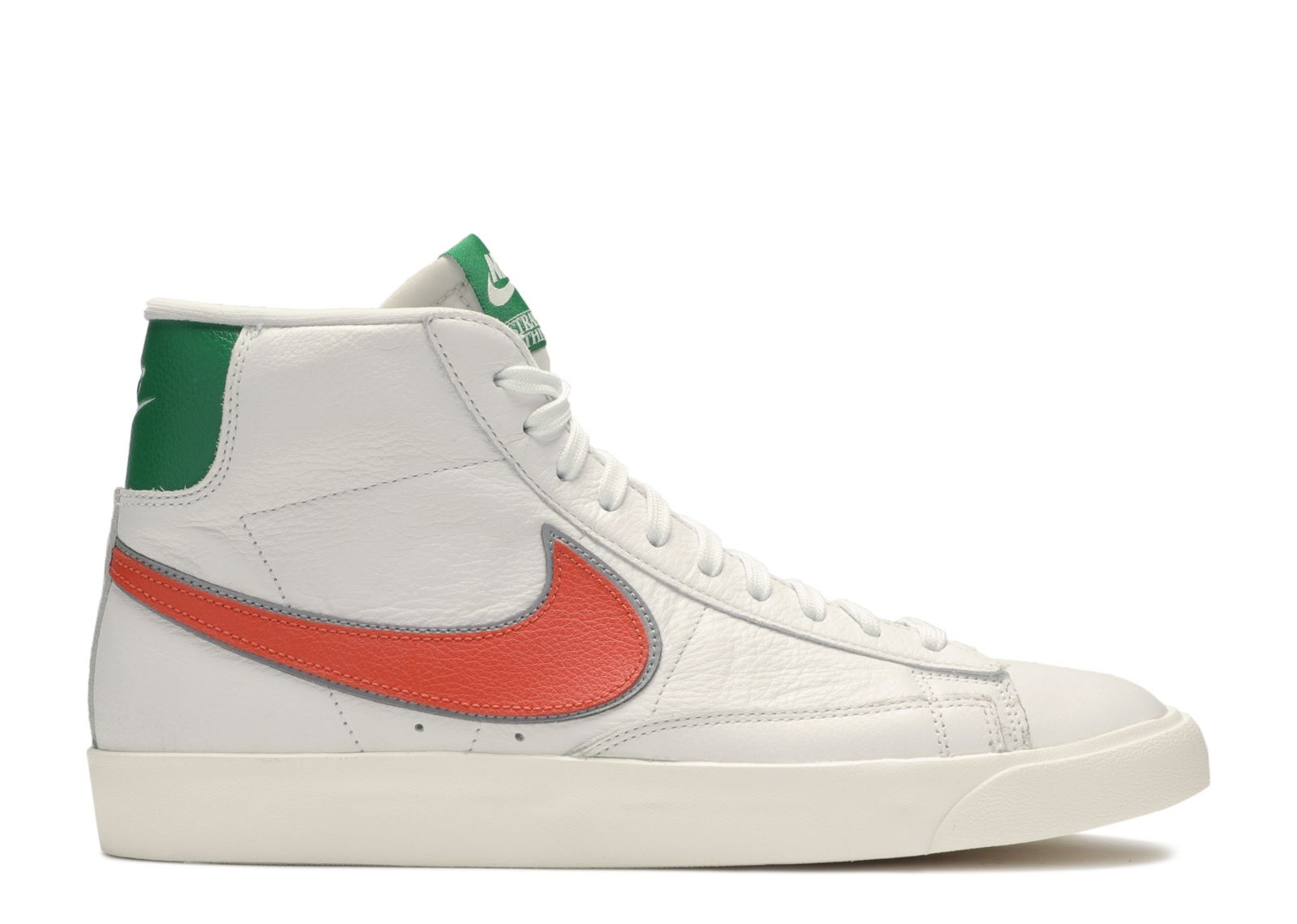 Part of the Hawkins High pack, the Stranger Things x Blazer Mid 'Hawkins High' released for the third season of Neflix's Stranger Things. Giving the nod to the local high school, the shoe features a white leather base accented by Cosmic Clay and Pine Green throughout. The tongue tag includes co-branding, while the medial side sports a Swoosh outline and the school's mascot. Underfoot, a rubber cupsole construction includes a herringbone traction pattern on the outsole. SKU: CJ6101 100 Colorway: white/cosmic clay-pine green Release Date: 6/27/19