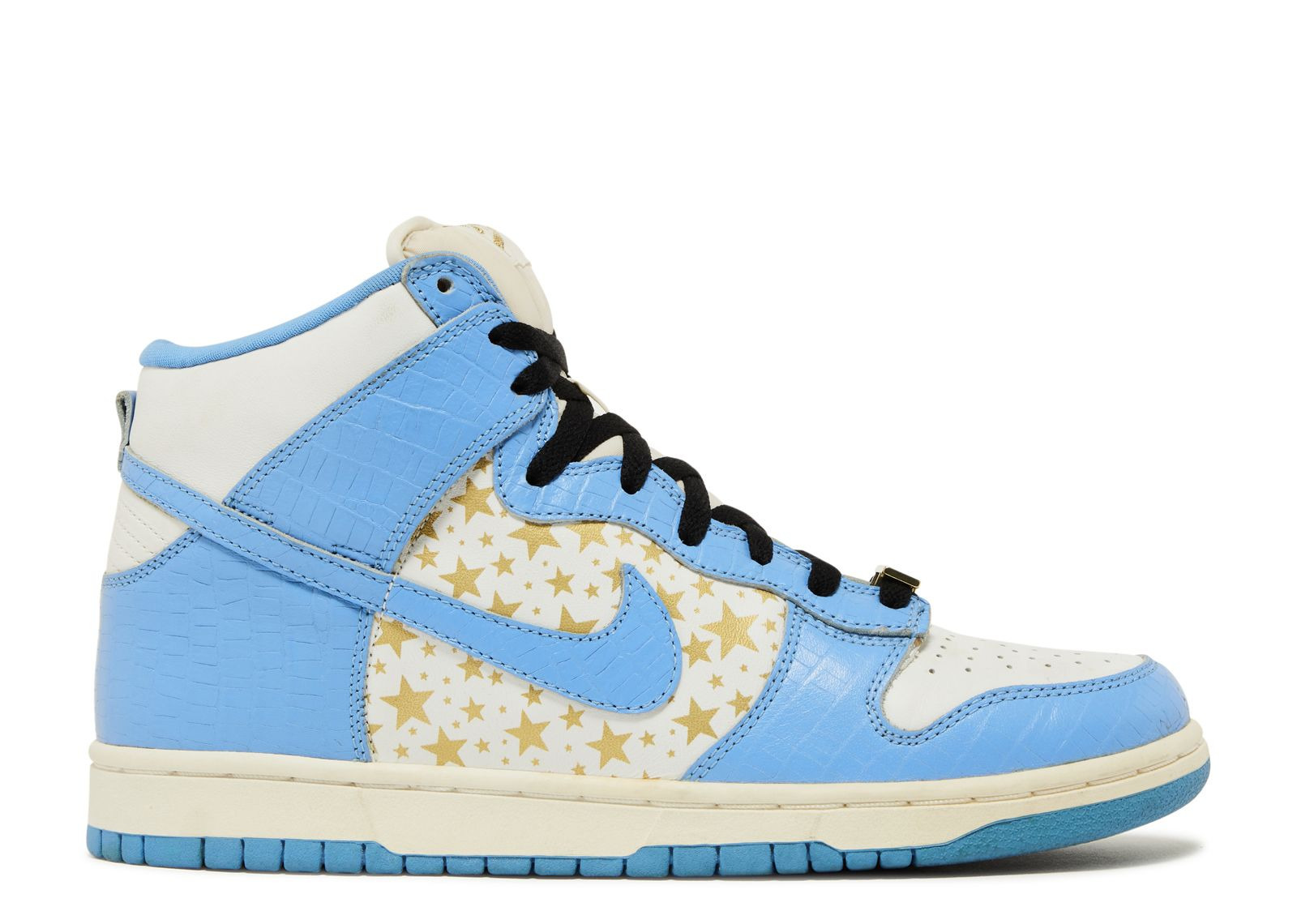 The New York City streetwear company borrowed three colorways from the 1985 Be True To Your School Dunk collection for Supreme's second collaboration with Nike SB in 2003. This 'University Blue' colorway features white leather with faux-crocodile skin overlays of University Blue, framing a pattern of gold star on the quarter panel. The padded tongue is completed in white, while a lace deubre with the Supreme brand appears in gold. The colorway was introduced alongside 'College Orange' and 'Varsity Red' as part of a highly limited release. SKU: 307385 141 Colorway: White/University Blue Release Date: 8/8/03