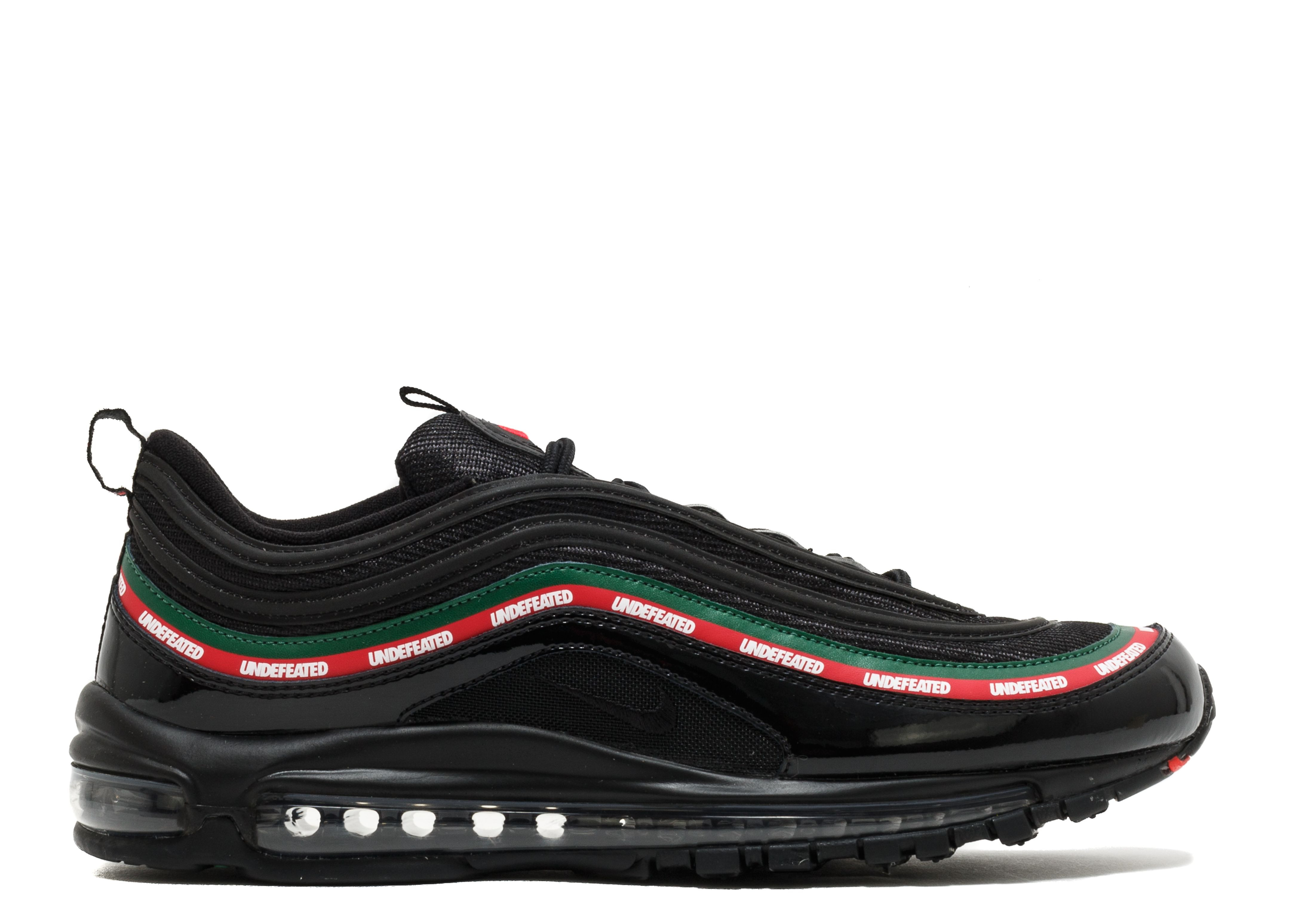 The Undefeated x Air Max 97 OG 'Black' pays tribute to the Air Max 97's popularity in Italy. Featuring a Gucci-inspired colorway, the black upper is accented by Gorge Green and Speed Red stripes above the patent leather mudguard. Undefeated branding emerges on the red stripe, while a full-length Max Air unit underfoot provides cushioning. The shoe helped celebrate the 20th anniversary of the silhouette as well as 15 years of Undefeated. SKU: AJ1986 001 Colorway: Black/Gorge Green-White-Speed Red Release Date: 9/21/17