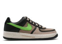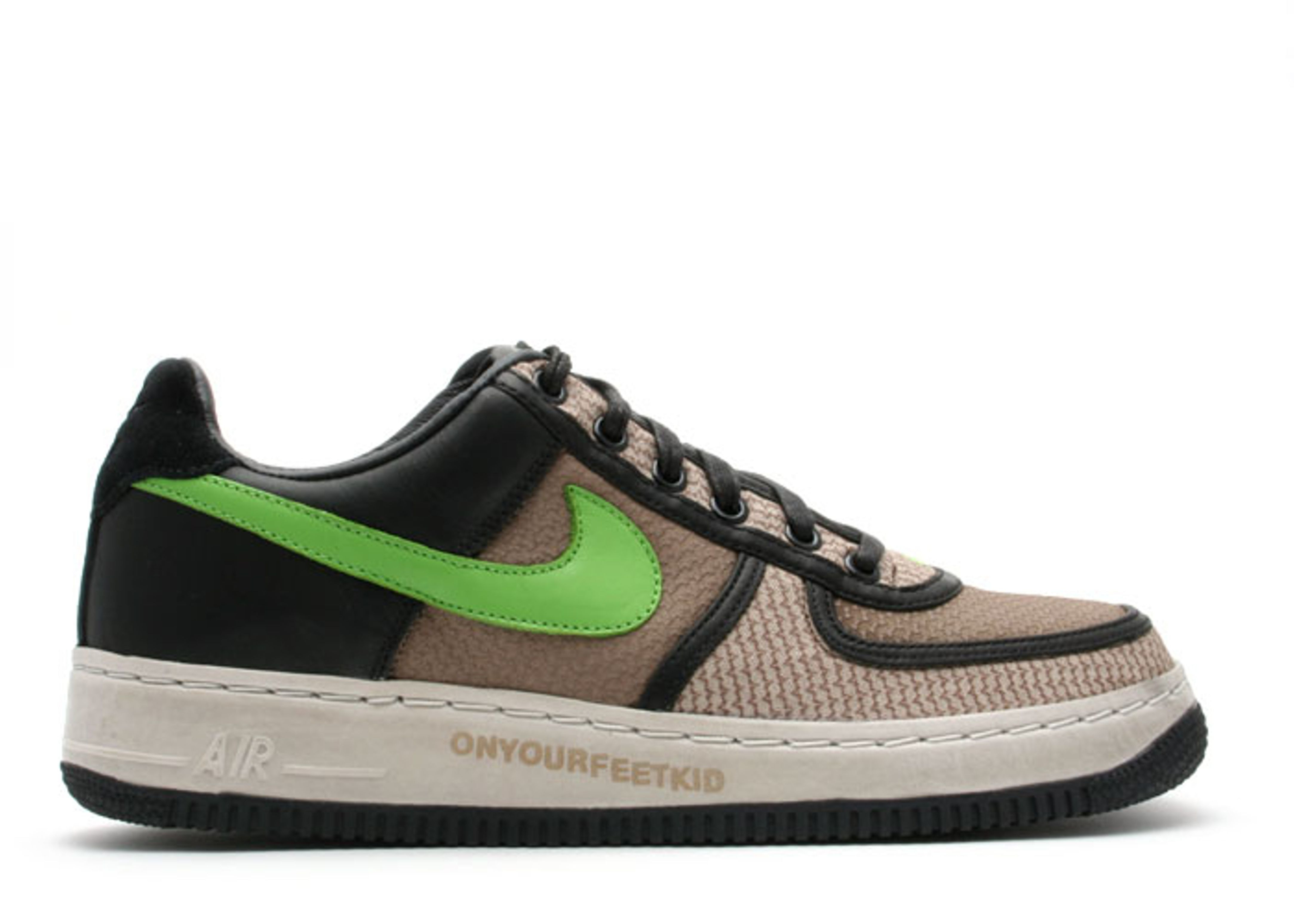 A 2006 release, the Undefeated x Air Force 1 Insideout Priority features a jacquard pattern on its Light Stone and Dark Brown forefoot and quarter panel, with black on the leather heel and suede heel patch. A collaboration between Undefeated and Nike, the shoe is highlighted by a Green Bean Swoosh, while the Air midsole is branded with 'On Your Feet Kid.' SKU: 314770 031 Colorway: Black/Green Bean-Light Brown-Dark Stone Release Date: 1/1/06